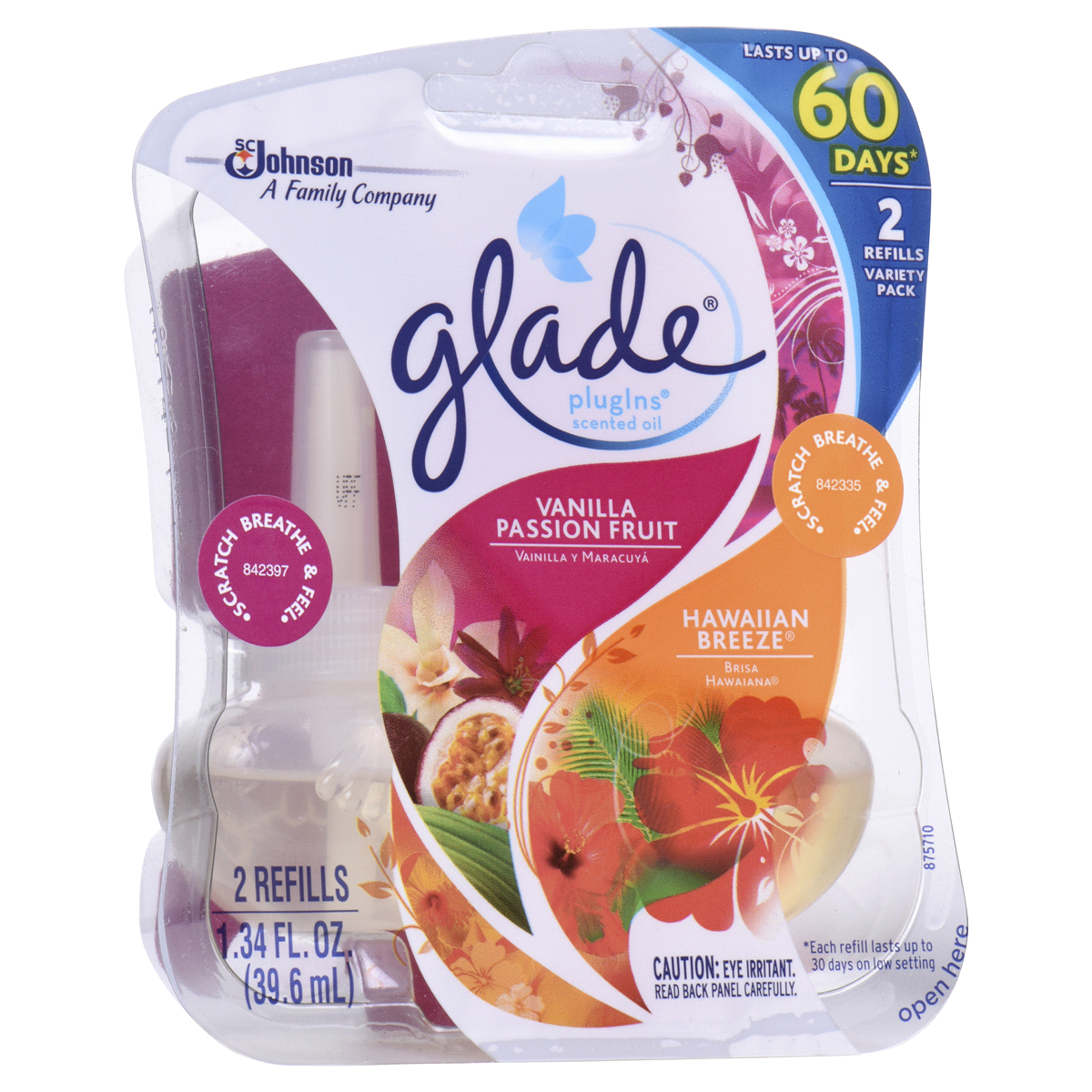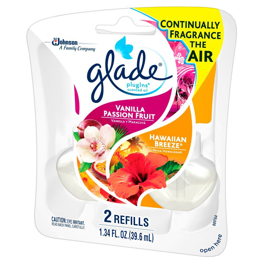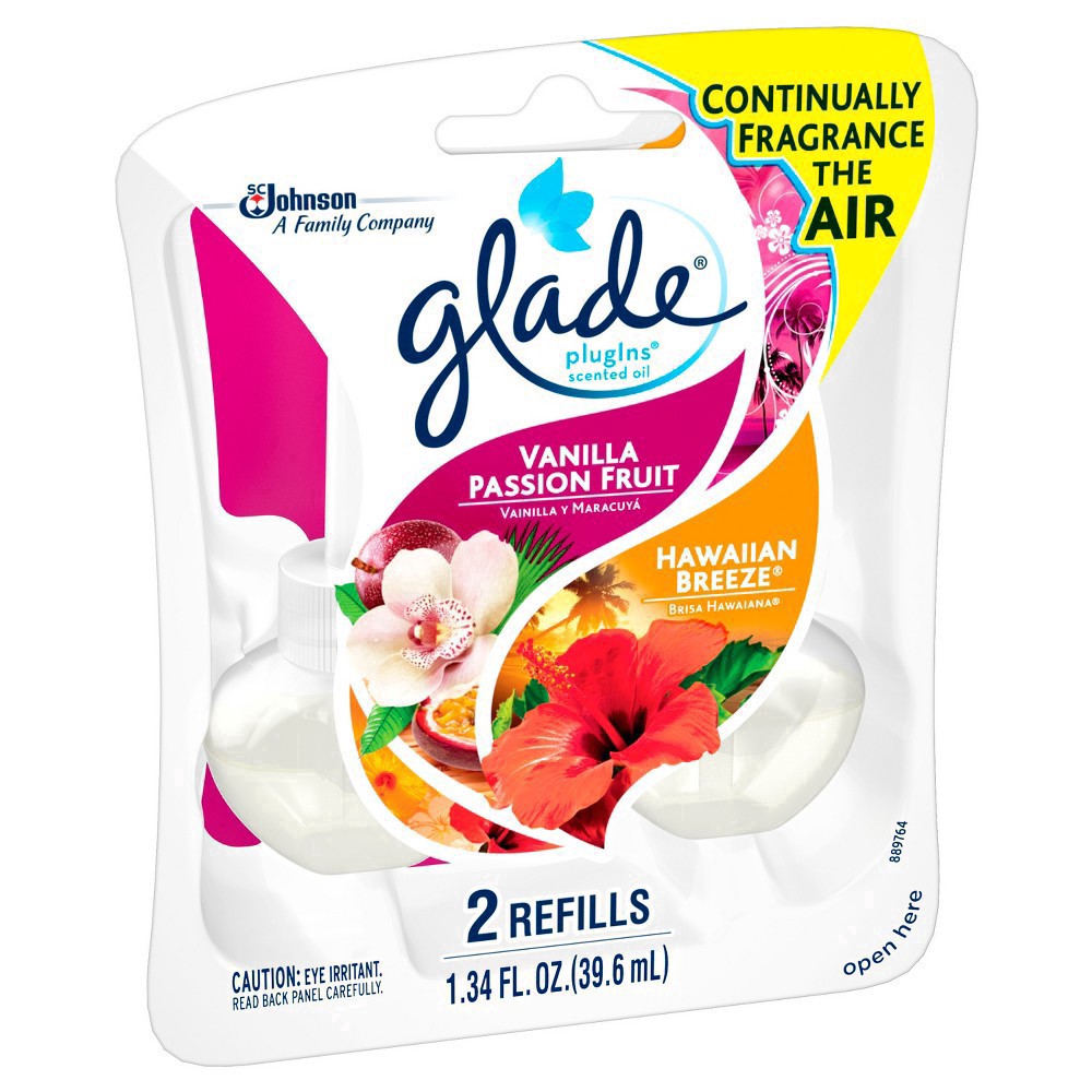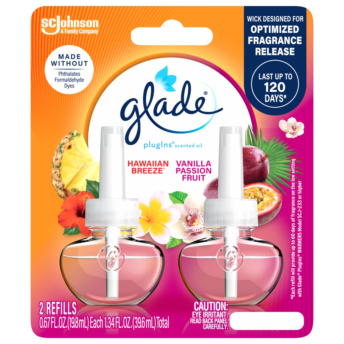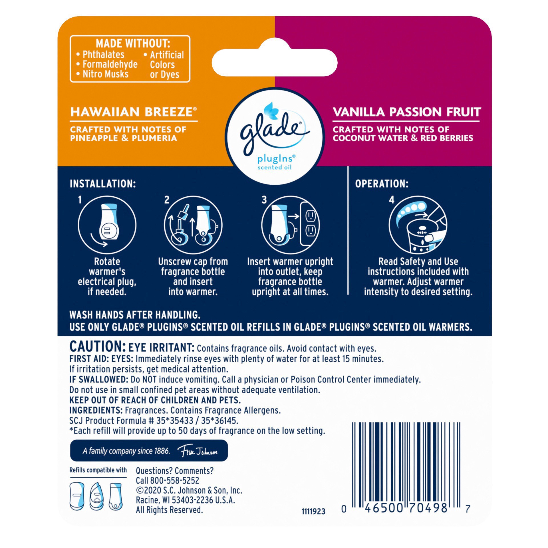 Glade PlugIns Scented Oil 2 Refills, Air Freshener, Hawaiian Breeze & Vanilla Passion Fruit, Essential Oil Infused Wall Plug In, 1.34 FL OZ, Pack of 2
