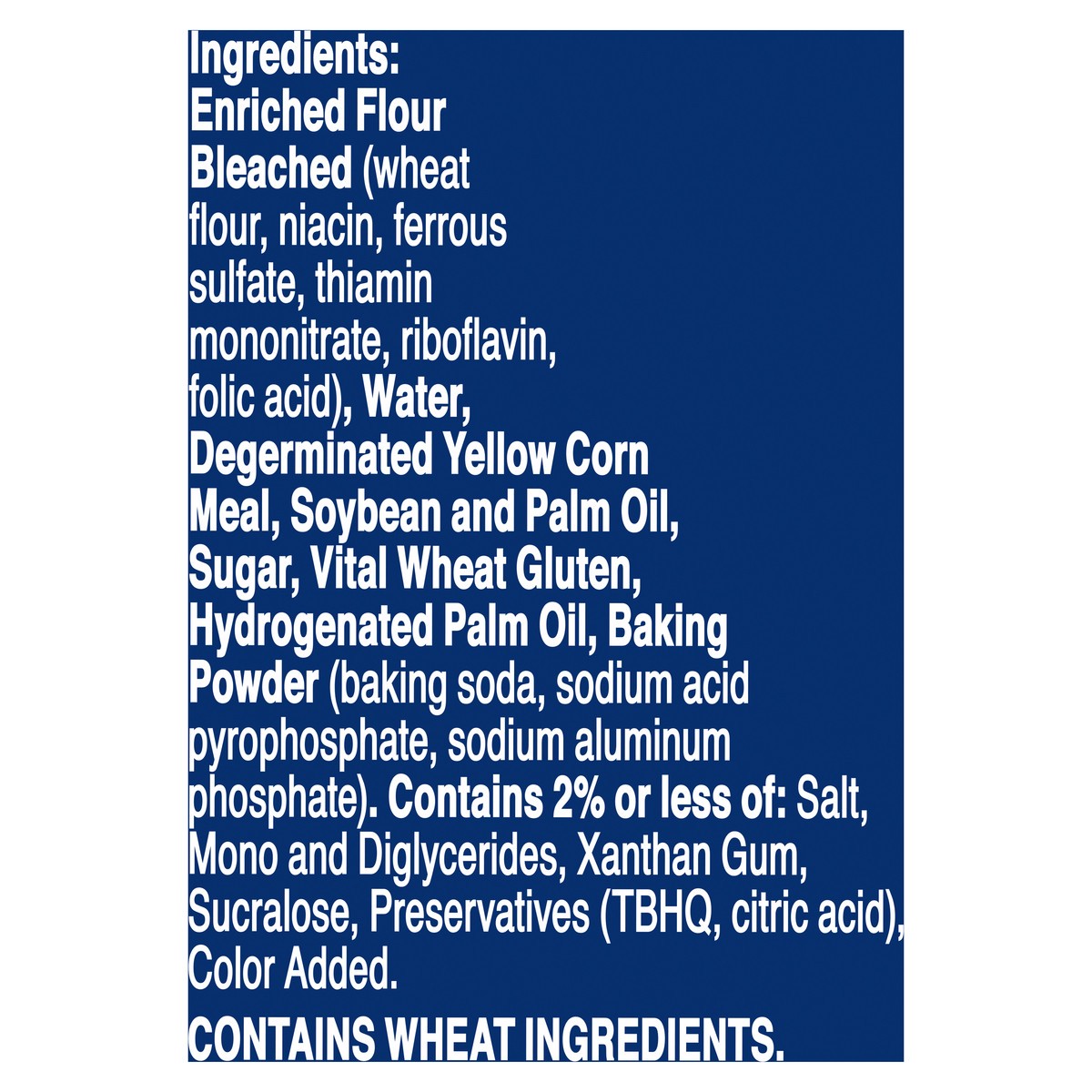Enriched Flour Bleached (Wheat Flour, Niacin, Ferrous Sulfate, Thiamin Mononitrate, Riboflavin, Folic Acid), Water, Degerminated Yellow Corn Meal, Soybean and Palm Oil, Sugar, Vital Wheat Gluten, Hydr…