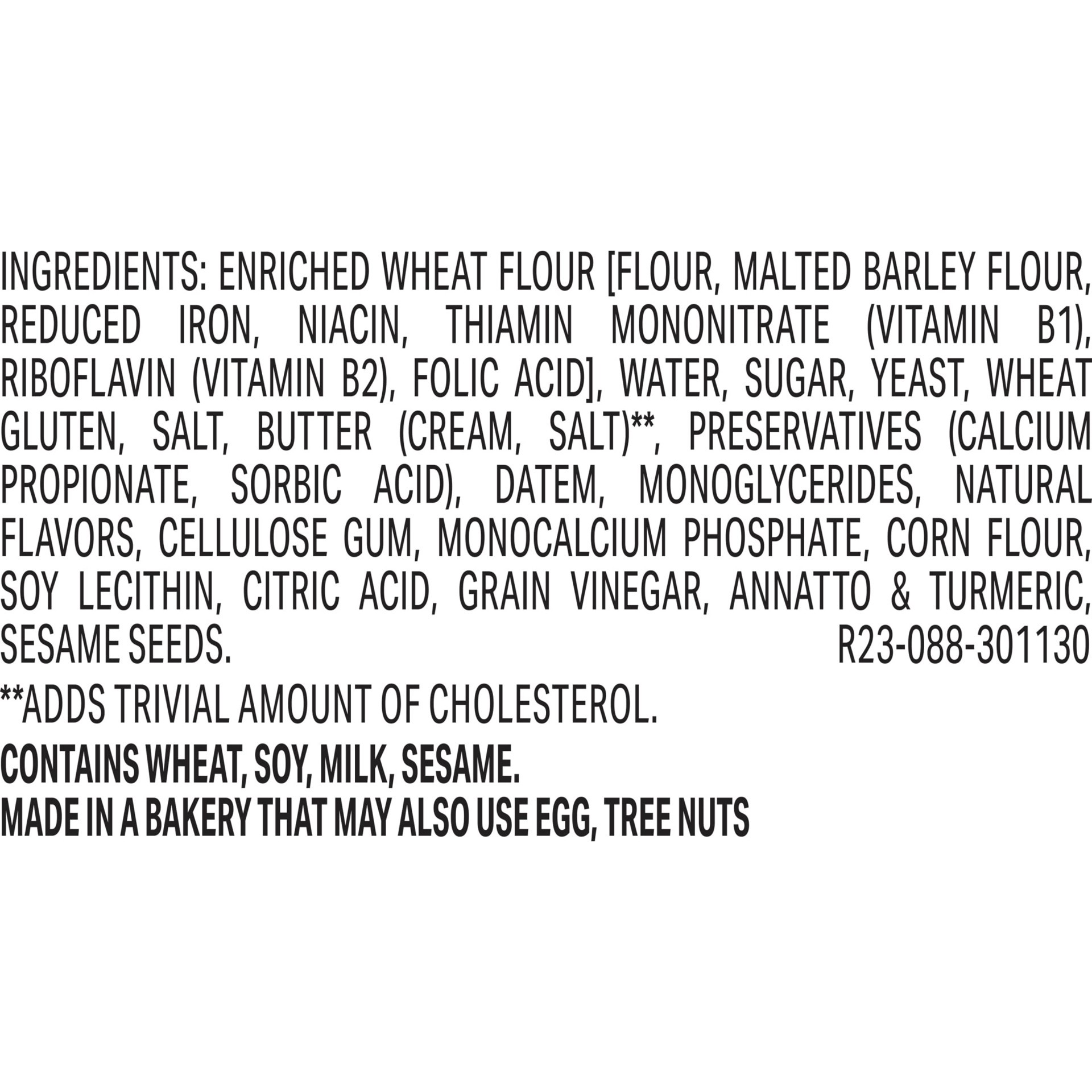 Enriched Wheat Flour [Flour, Malted Barley Flour, Reduced Iron, Niacin, Thiamin Mononitrate, Riboflavin, Folic Acid], Water, Sugar, Yeast, Wheat Gluten, Salt, Butter [Cream, Salt], Preservatives [Calc…