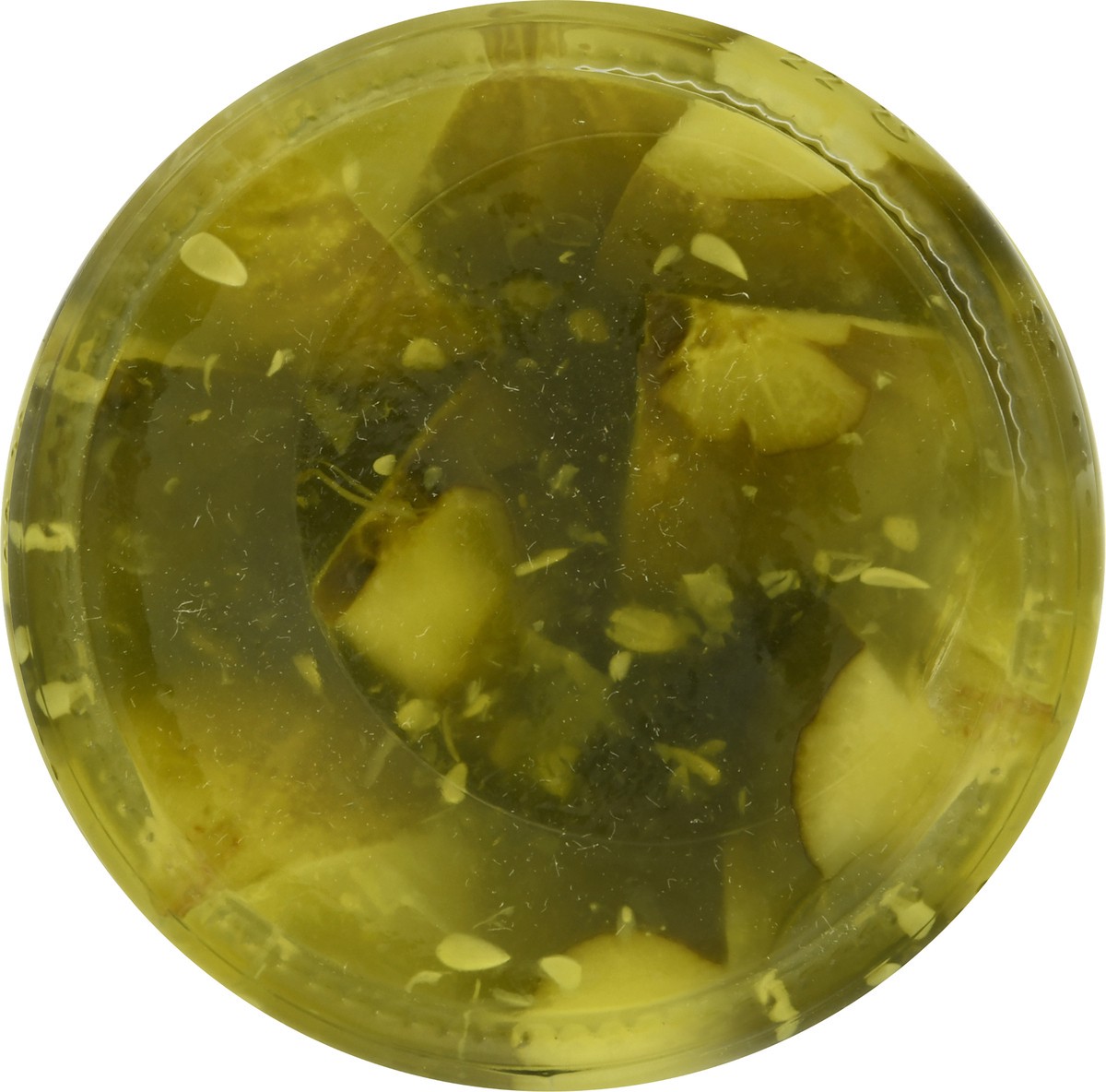 Cucumbers, Water, Vinegar, Salt, Calcium Chloride (Firming Agent), Sodium Benzoate (Preservative), Natural Flavors, Polysorbate 80, and Yellow 5.