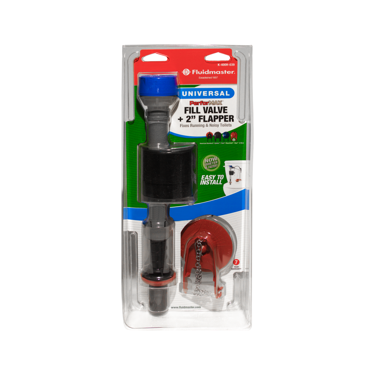 The Fluidmaster K-400H-039 PerforMAX Toilet Fill Valve and 2" Flapper Kit offers the best solution to optimize your toilet flush, while saving water and money. Quickly solve common toilet problems suc…