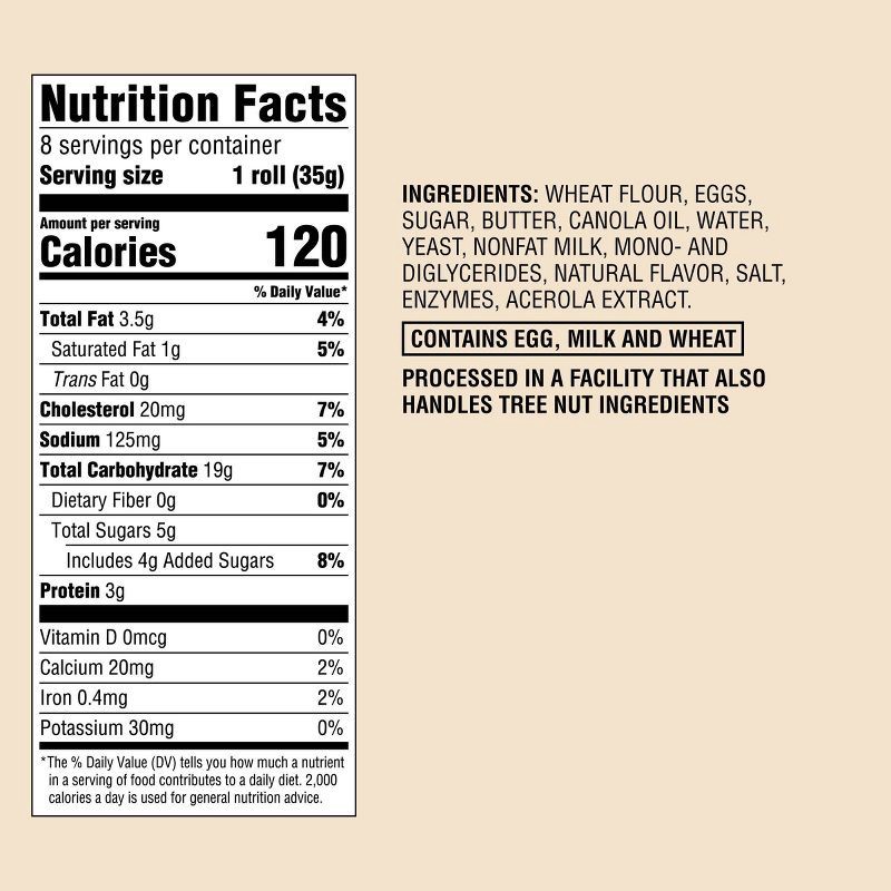 WHEAT FLOUR, EGGS, SUGAR, BUTTER, CANOLA OIL, WATER, YEAST, NONFAT MILK, MONO- AND DIGLYCERIDES, NATURAL FLAVOR, SALT, ENZYMES, ACEROLA EXTRACT.