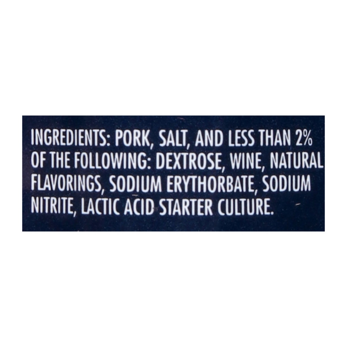 Pork, Salt, and Less than 2% of the Following: Dextrose, Wine, Natural Flavorings, Sodium Erythorbate, Sodium Nitrite, Lactic Acid Starter Culture.