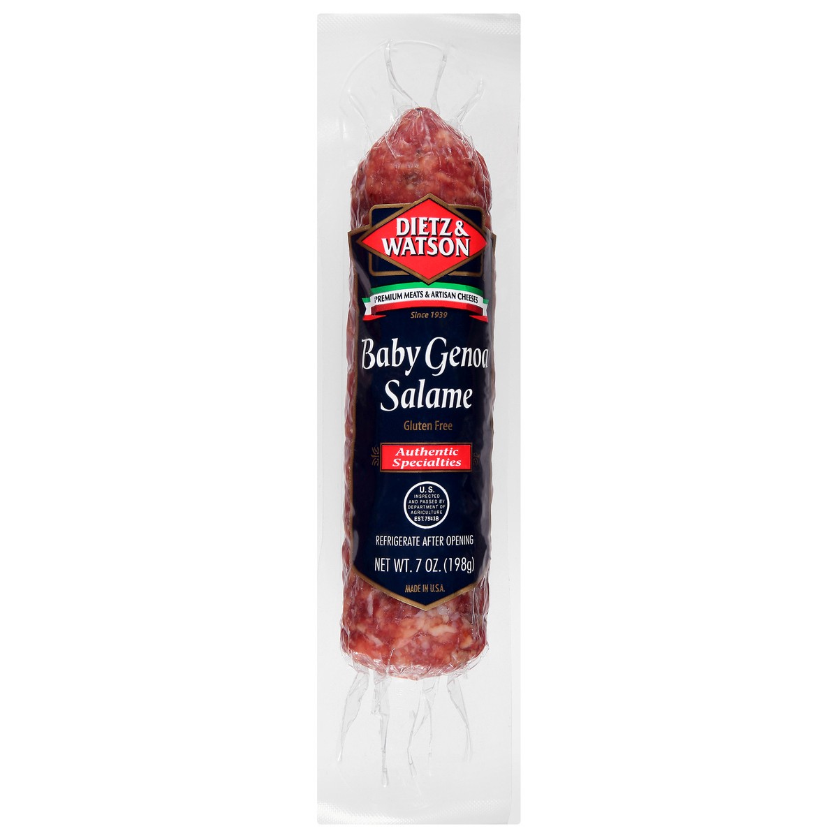 Gluten free. Authentic specialties. Premium meats & artisan cheese. Since 1939. U.S. Inspected and passed by Department of Agriculture EST. 7543B. www.dietzandwatson.com. Made in USA.