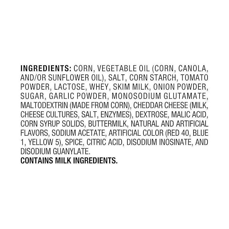 Corn, Vegetable Oil (Corn, Canola, Soybean, And/Or Sunflower Oil), And Less Than 2% Of Salt, Corn Maltodextrin, Onion Powder, Cheddar Cheese (Milk, Cheese Cultures, Salt, Enzymes), Tomato Powder, Garl…