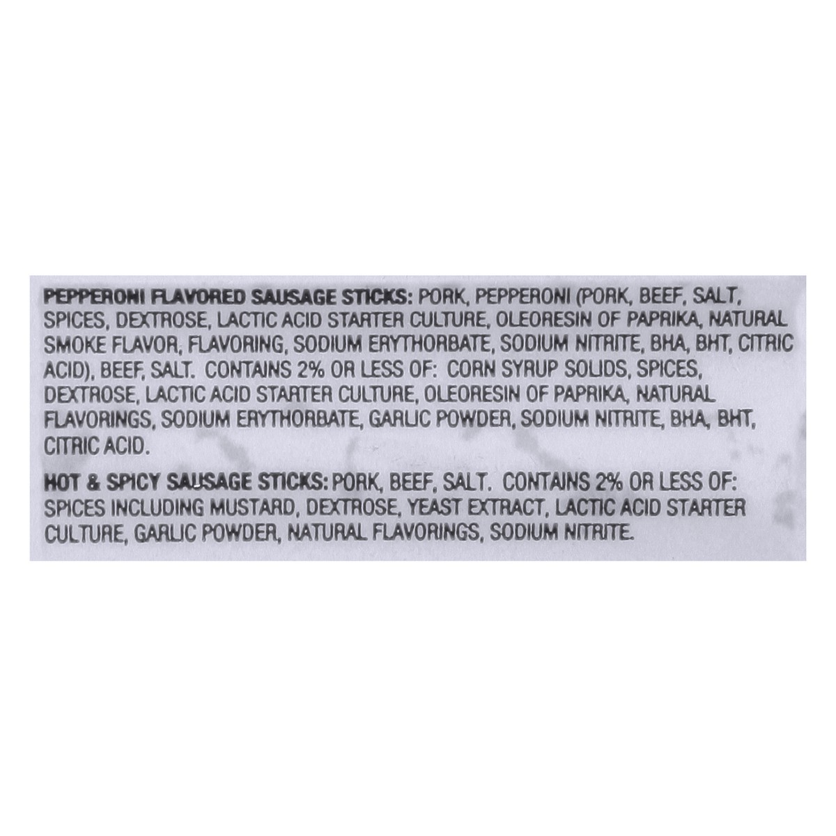 Pork, Beef, Salt. Contains 2% or Less of: Spices Including Mustard, Dextrose, Yeast Extract, Lactic Acid Starter Culture, Garlic Powder, Natural Flavorings, Sodium Nitrite.