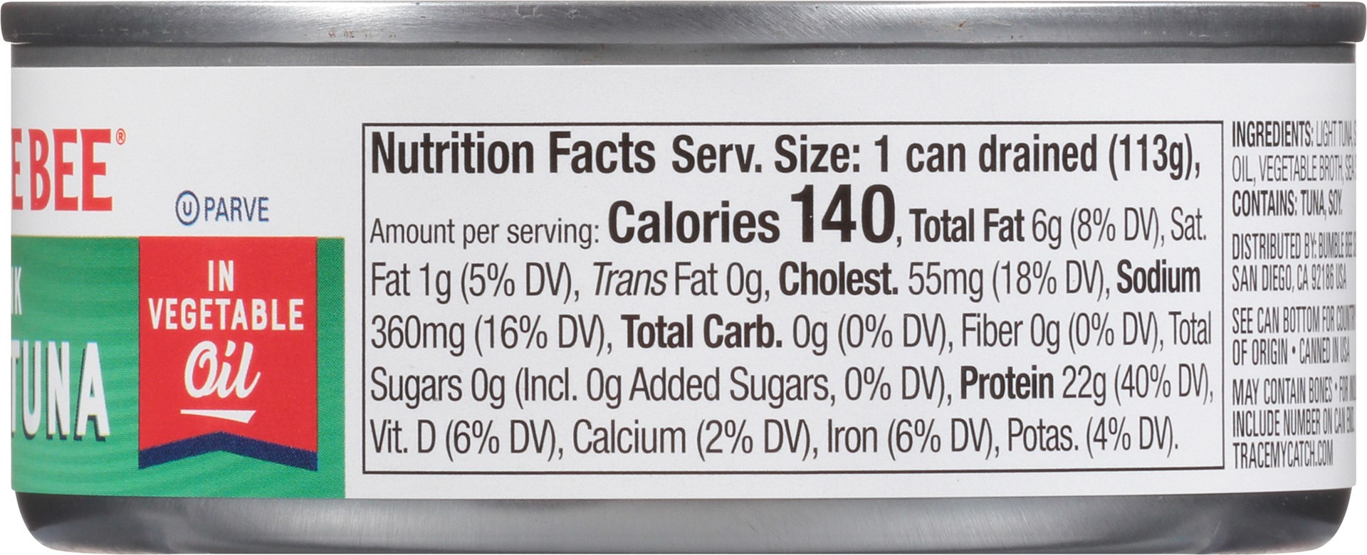 In vegetable oil. Contains 22 g protein. Gluten free. Non GMO Project verified. nongmoproject.org. Dolphin Safe: U.S. Department of Commerce. bumblebee.com. tracemycatch.com. For inquiries include num…