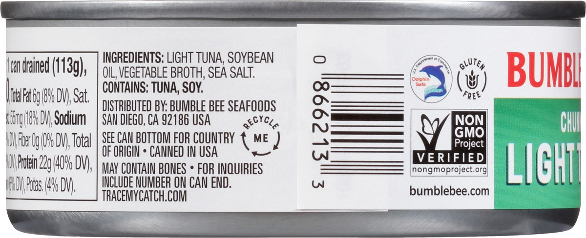 In vegetable oil. Contains 22 g protein. Gluten free. Non GMO Project verified. nongmoproject.org. Dolphin Safe: U.S. Department of Commerce. bumblebee.com. tracemycatch.com. For inquiries include num…