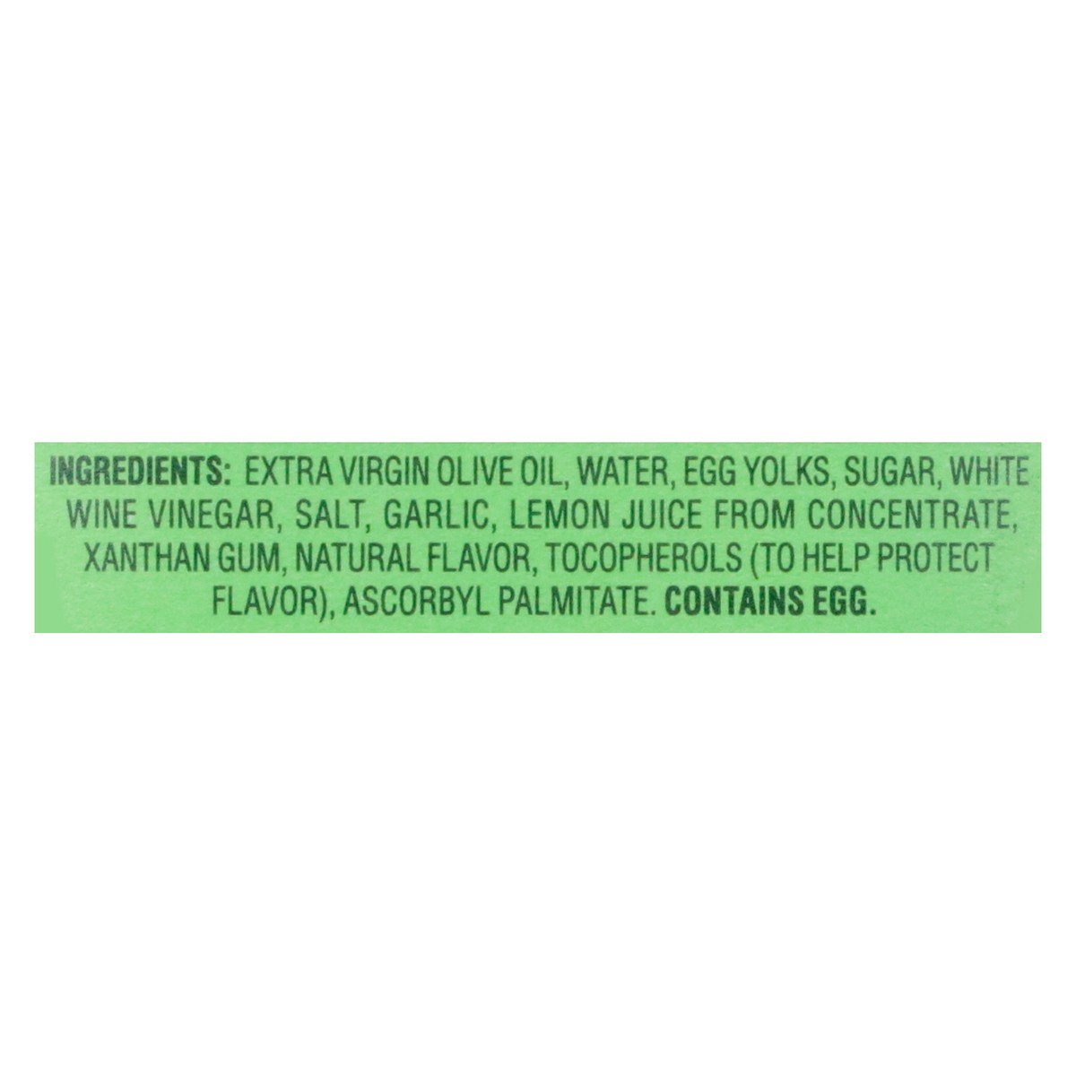 Extra Virgin Olive Oil (70%), Water, Cage Free Egg Yolks, Sugar, White Wine Vinegar, Salt, Garlic, Lemon Juice from Concentrate, Xanthan Gum, Natural Flavor, Tocopherols (Antioxidant), Vitamin C Palmi…