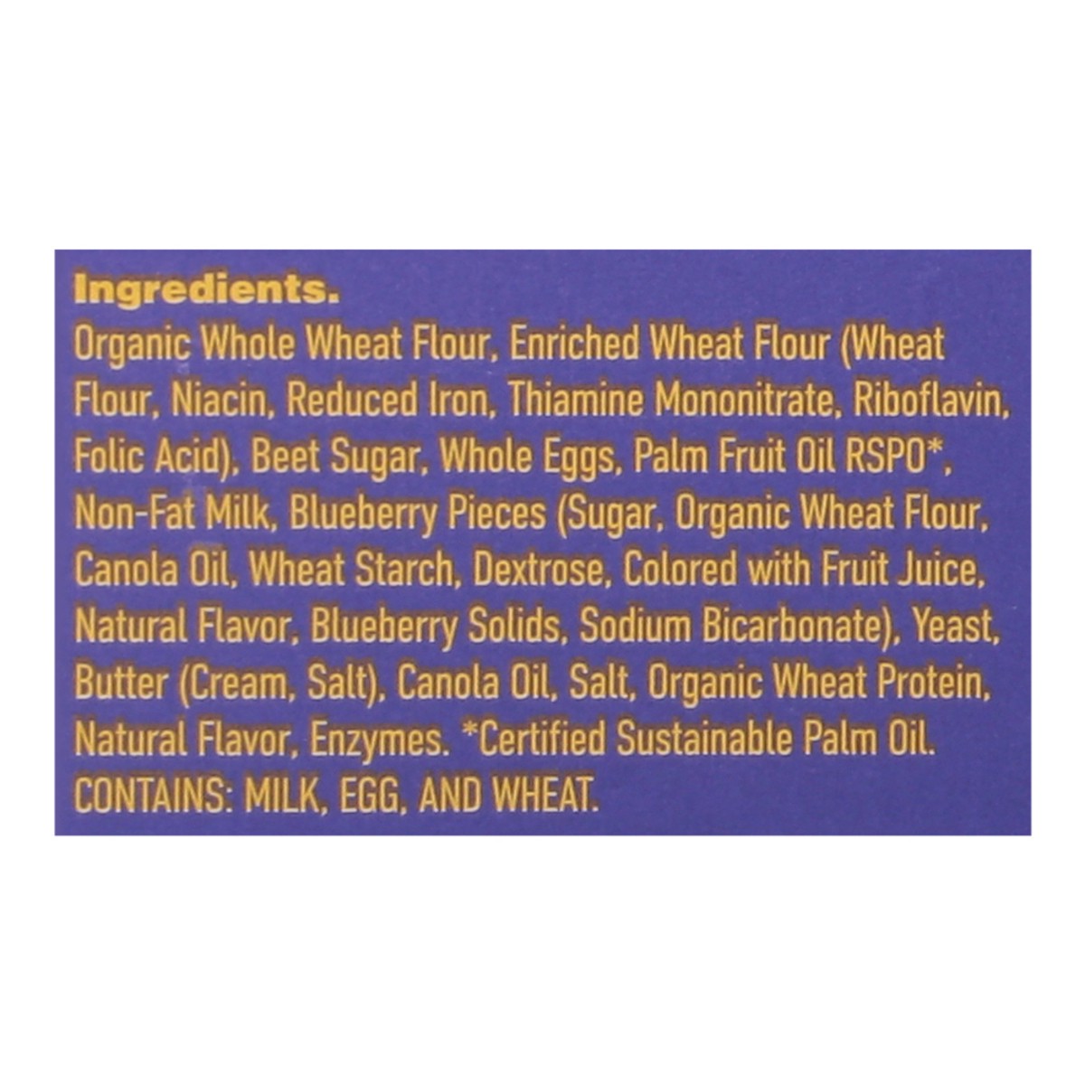 Organic Whole Wheat Flour, Enriched Wheat Flour (Wheat Flour, Niacin, Reduced Iron, Thiamine Mononitrate, Riboflavin, Folic Acid), Beet Sugar, Whole Eggs, Palm Fruit Oil RSPO (Certified Sustainable Pa…