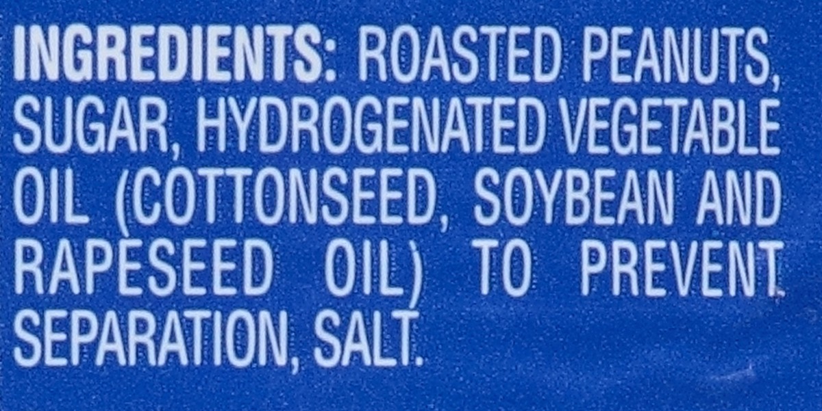 Roasted Peanuts, Sugar, Hydrogenated Vegetable Oil (Cottonseed, Soybean and Rapeseed Oil) to Prevent Separation, Salt.