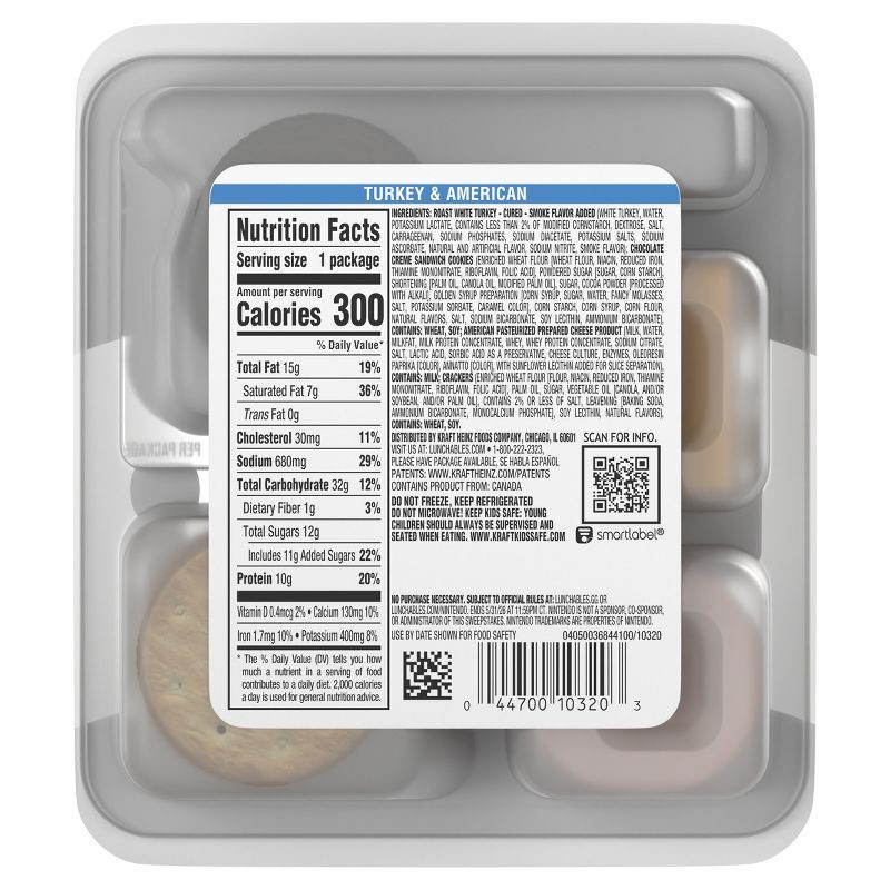- Contains cured roast white turkey with smoke flavor added, American pasteurized prepared cheese product, buttery, flaky crackers and chocolate creme sandwich cookies