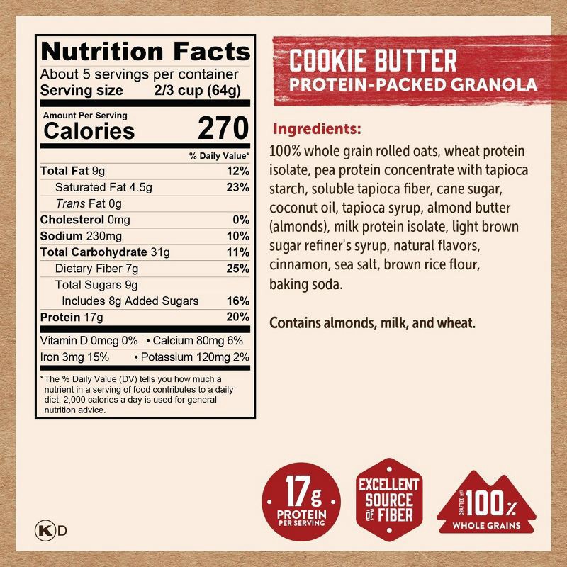 100% Whole Grain Rolled Oats, Wheat Protein Isolate, Pea Protein Concentrate with Tapioca Starch, Soluble Tapioca Fiber, Cane Sugar, Coconut Oil, Tapioca Syrup, Almond Butter (Almonds), Milk Protein I…