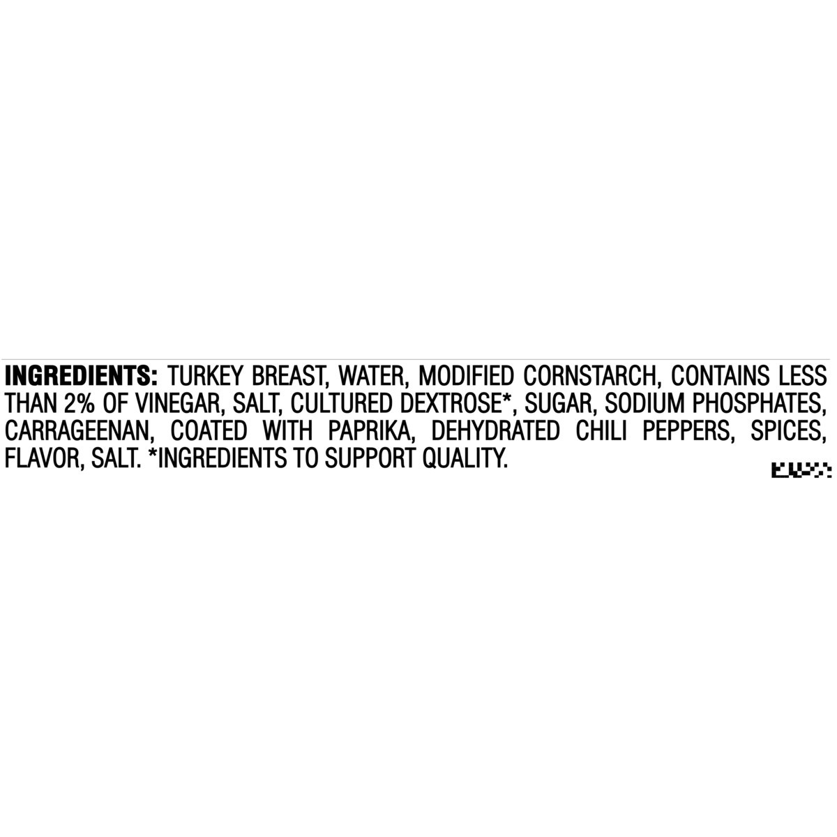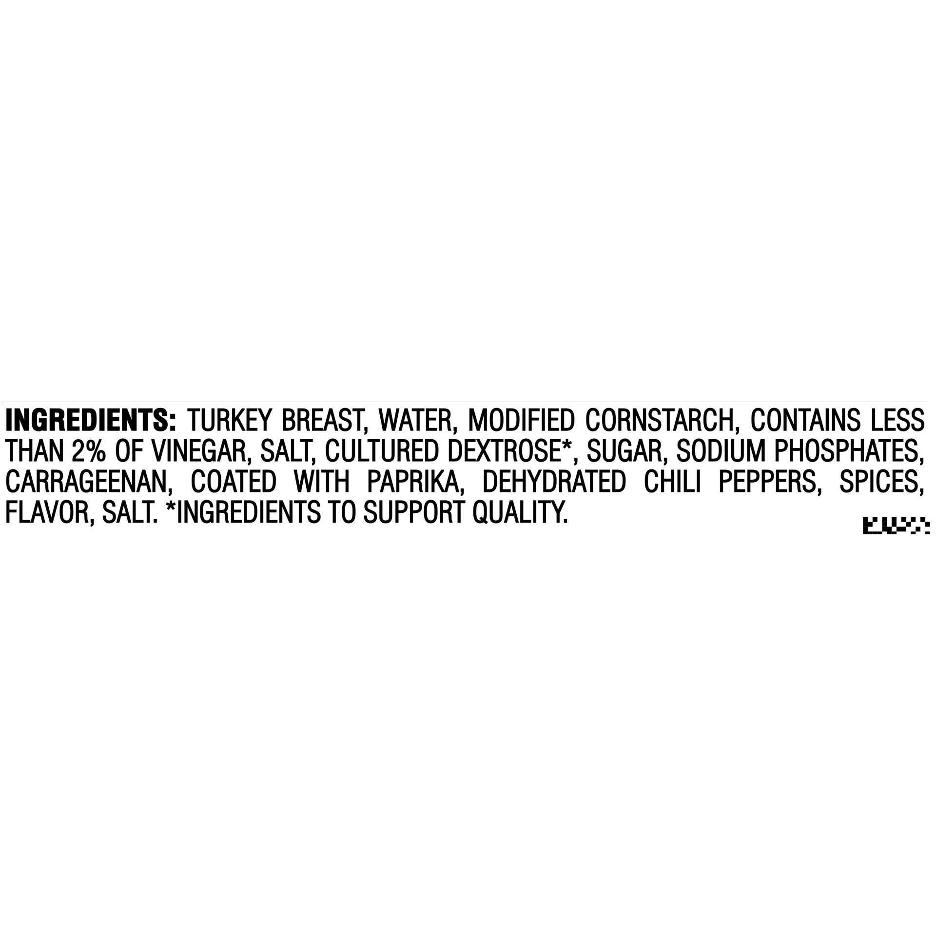 Turkey Breast, Water, Modified Cornstarch, Contains Less Than 2% Of Vinegar, Salt, Cultured Dextrose, Sugar, Sodium Phosphates, Carrageenan, Coated With Paprika, Dehydrated Chili Peppers, Spices, Flav…