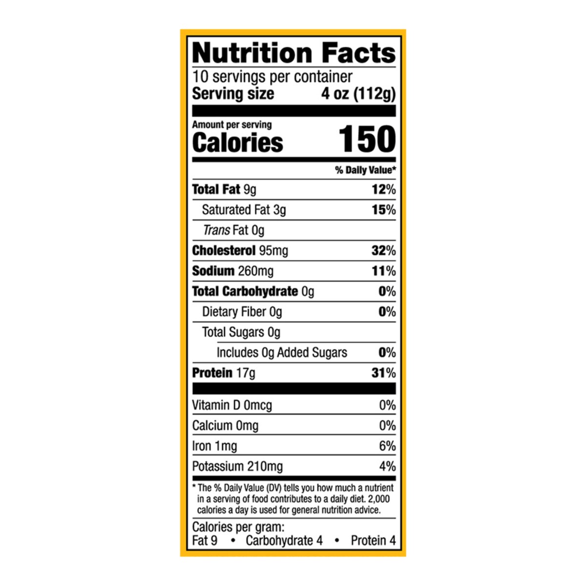 Per Serving: 150 calories; 3 g sat fat (15% DV); 260 mg sodium (11% DV); 0 g total sugars; 17 g protein (31% DV). Serving families since 1939. Contains up to 10% solution of water and kosher salt. Ice…