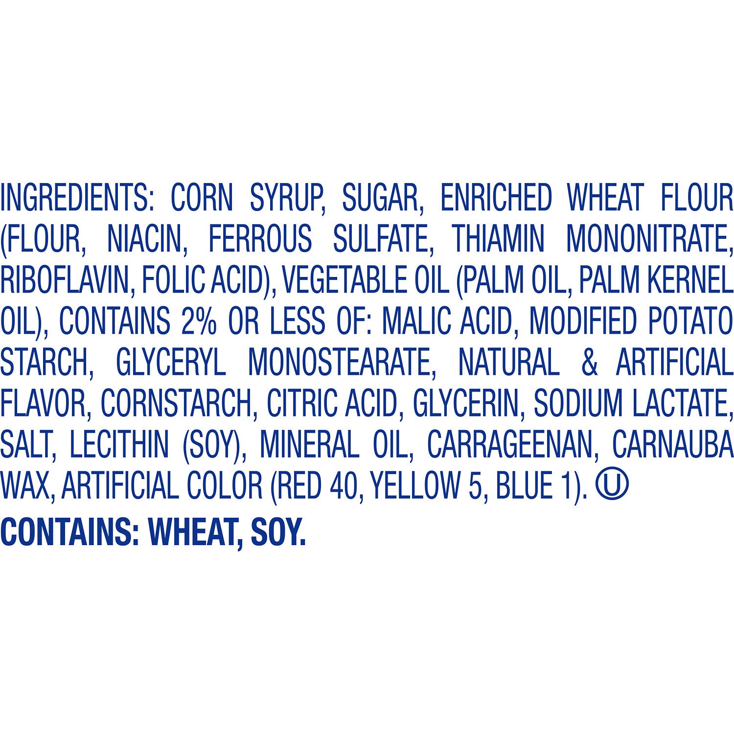 CORN SYRUP, SUGAR, ENRICHED WHEAT FLOUR (FLOUR, NIACIN, FERROUS SULFATE, THIAMIN MONONITRATE, RIBOFLAVIN, FOLIC ACID), VEGETABLE OIL (PALM OIL, PALM KERNEL OIL), CONTAINS 2% OR LESS OF: MALIC ACID, MO…