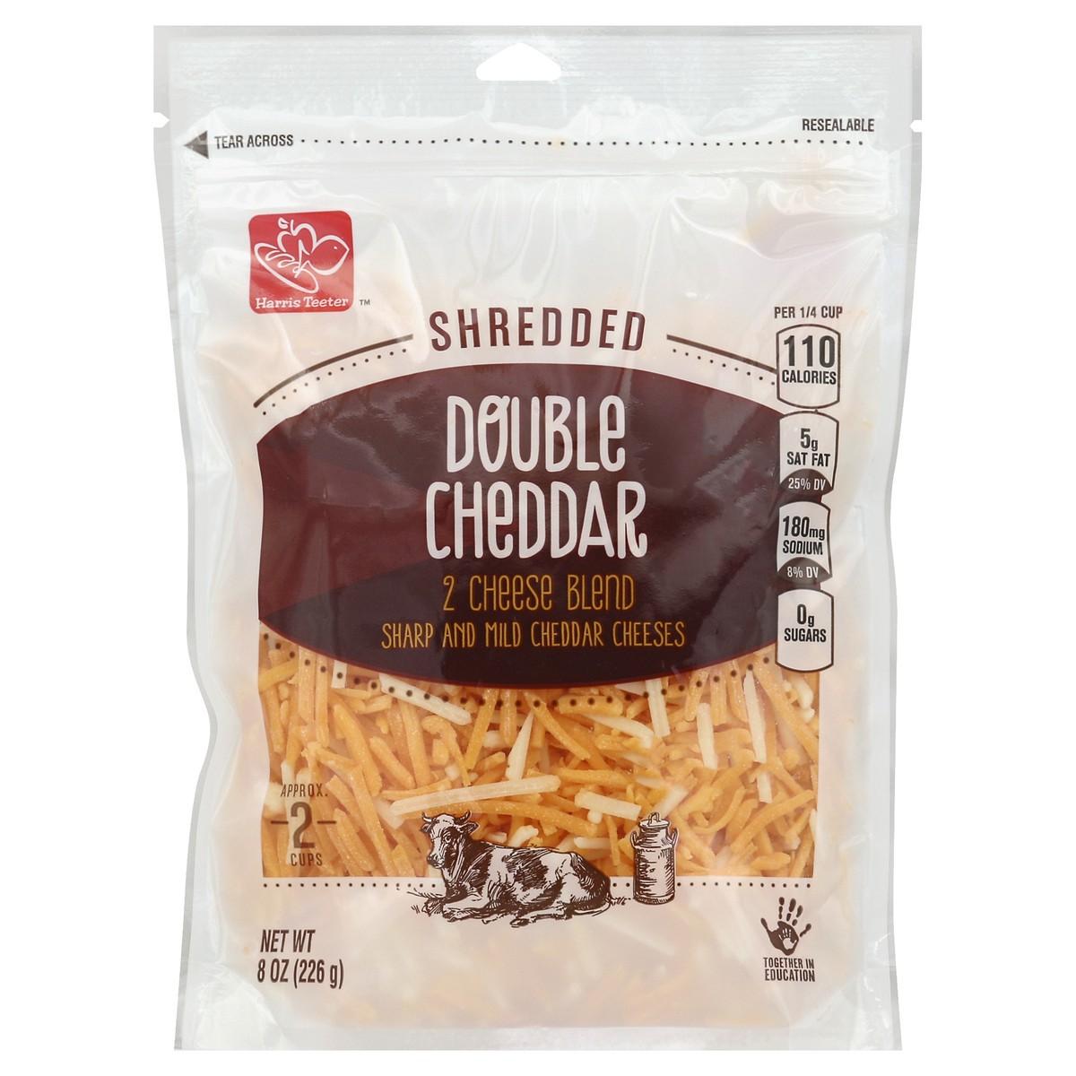Sharp and mild cheddar cheeses. Per 1/4 Cup: 110 calories; 5 g sat fat (25% DV); 180 mg sodium (8% DV); 0 g sugars. Approx 2 cups. Together in Education. Resealable. Your Plus Guarantee: If you are no…