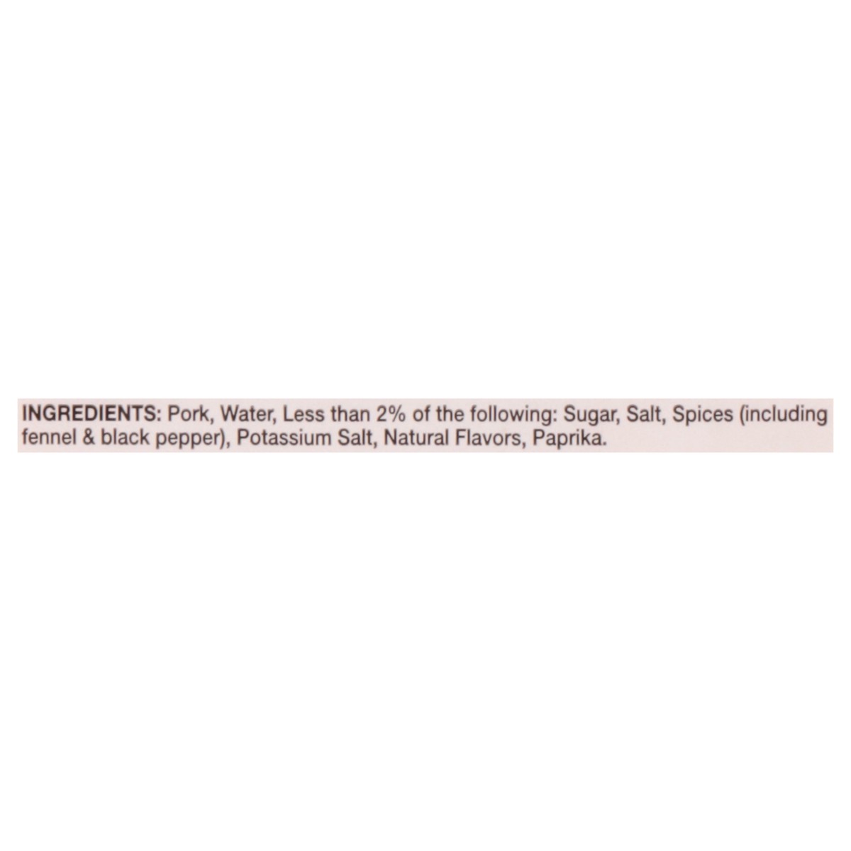 Pork, Water, Less than 2% of the Following: Sugar, Salt, Spices (Including Fennel & Black Pepper), Potassium Salt, Natural Flavors, Paprika.