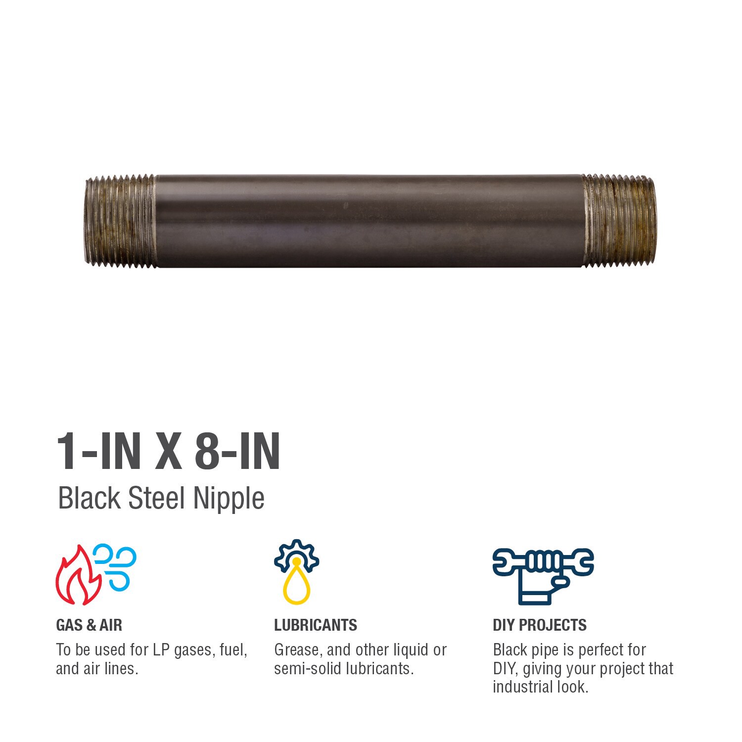 Generally used for lubricant, oil, grease, liquefied petroleum (LP) gas, natural gases (nitrogen, oxygen, etc.), steam and diesel. Schedule 40 nipple. Use to repair pipe or make an extension from a fi…