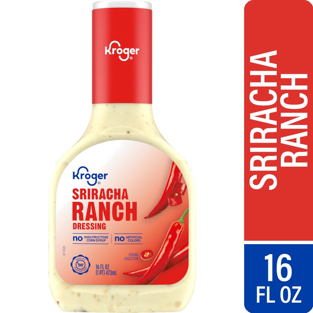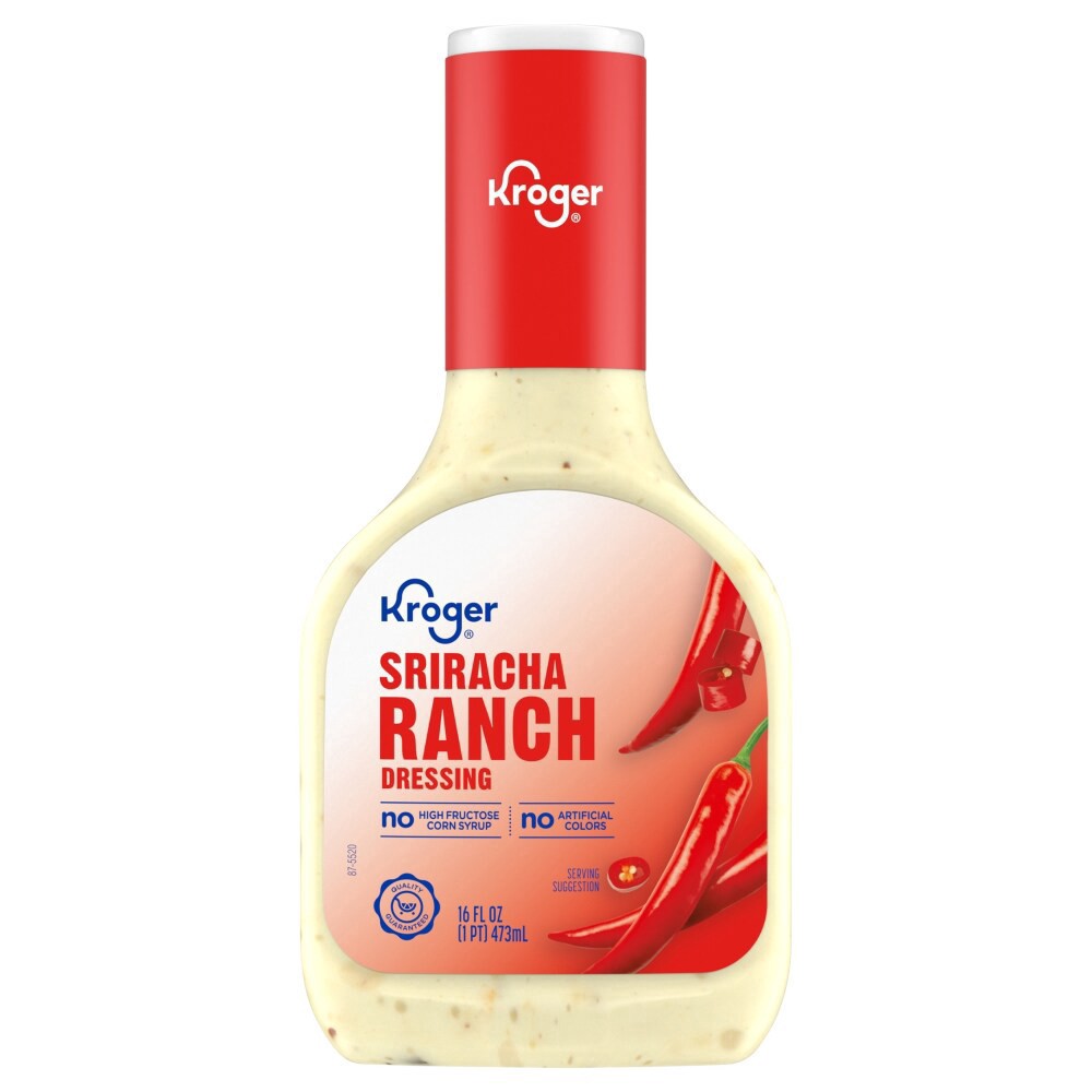 Kroger® Sriracha Ranch Salad Dressing spices up meals with a zesty bang! It's a blend of low-fat buttermilk with a kick of chili sauce, creating a spicy flavor explosion in every drop. Smooth cage fre…