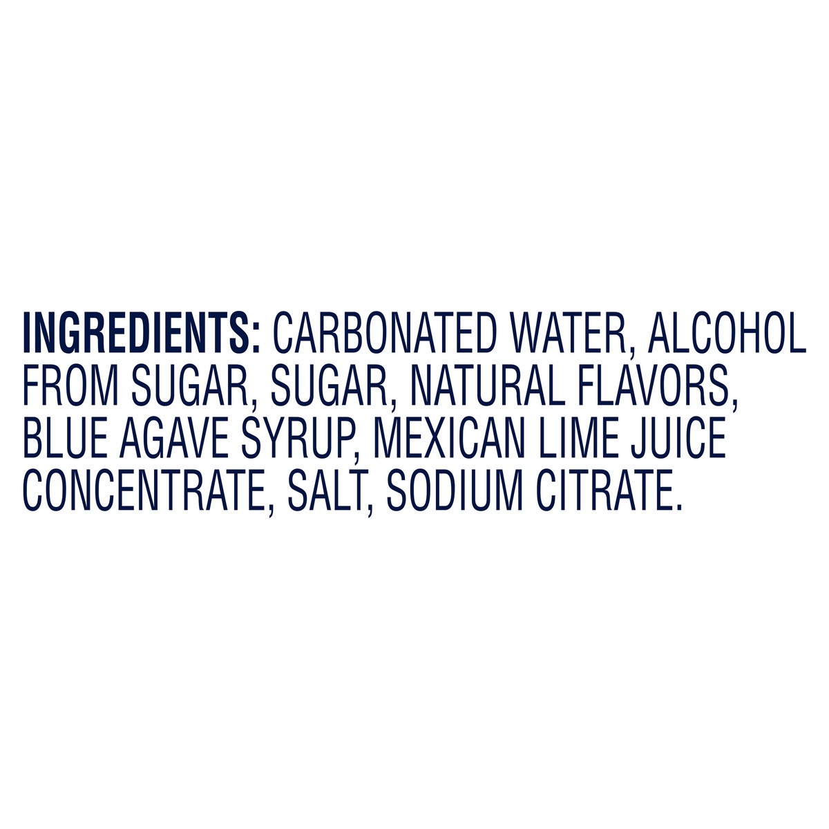 Carbonated Water, Alcohol from Sugar, Sugar, Natural Flavors, Blue Agave Syrup, Mexican Lime Juice Concentrate, Salt, Sodium Citrate.