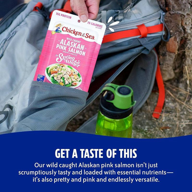 Pink Salmon, known for its mild taste, is caught from the cold, clear waters in Alaska. To protect thecleanest waters in the world, Chicken of the Sea Salmon is certified by the Marine Steward ShipCou…