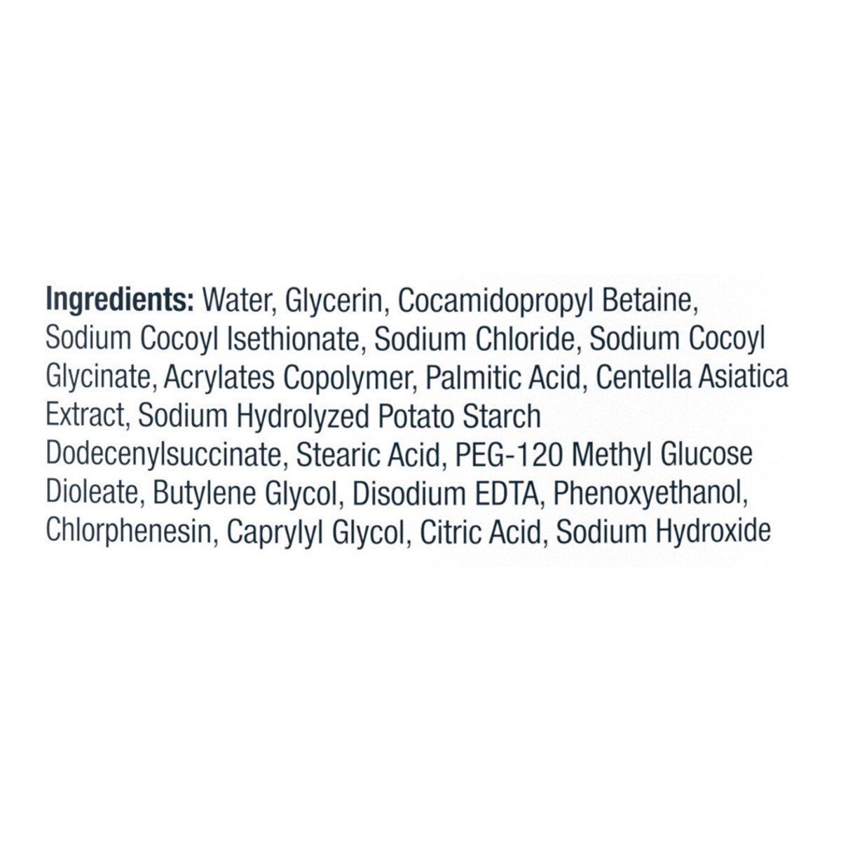 Water, Glycerin, Cocamidopropyl Betaine, Sodium Cocoyl Isethionate, Sodium Chloride, Sodium Cocoyl Glycinate, Acrylates Copolymer, Palmitic Acid, Centella Asiatica Extract, Sodium Hydrolyzed Potato St…