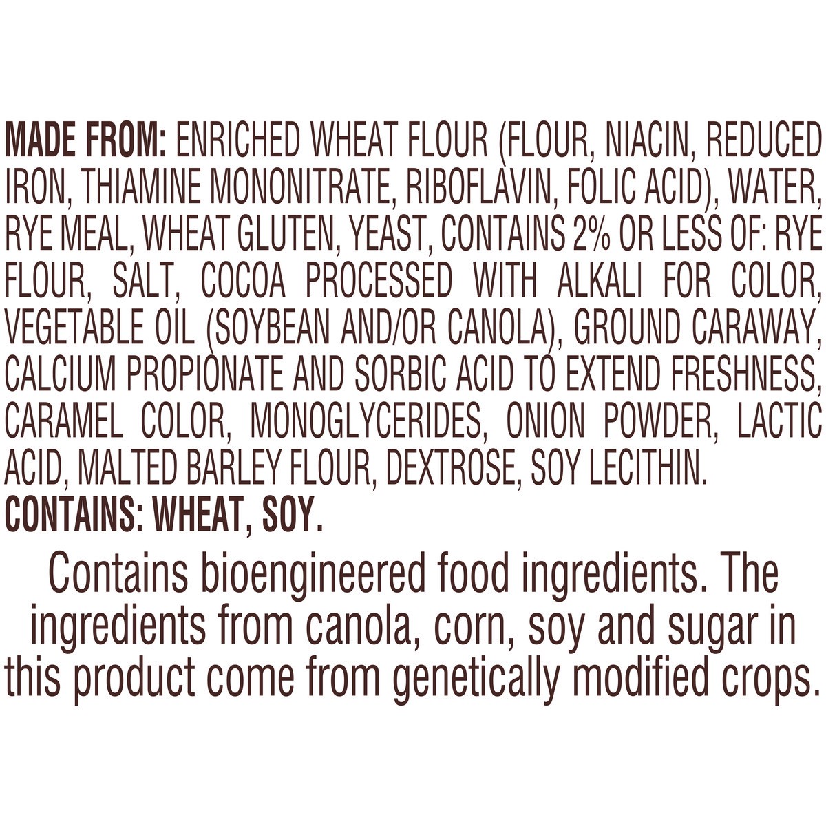 MADE FROM: ENRICHED WHEAT FLOUR (FLOUR, NIACIN, REDUCED IRON, THIAMINE MONONITRATE, RIBOFLAVIN, FOLIC ACID), WATER, RYE MEAL, WHEAT GLUTEN, YEAST, CONTAINS 2% OR LESS OF: RYE FLOUR, SALT, COCOA PROCES…