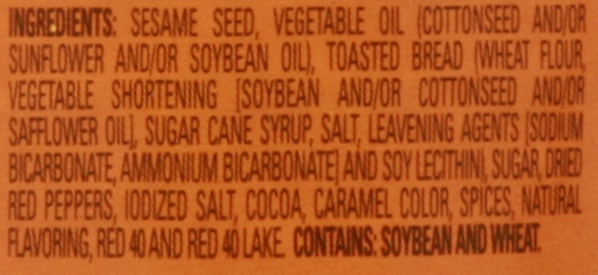 Sesame Seed , Vegetable Oil ( Cottonseed Oil And/Or Sunflower Oil And/Or Soybean Oil ) , Toasted Bread ( Wheat Flour , Vegetable Shortening [ Soybean Oil And/Or Cottonseed Oil And/Or Safflower Oil ] ,…