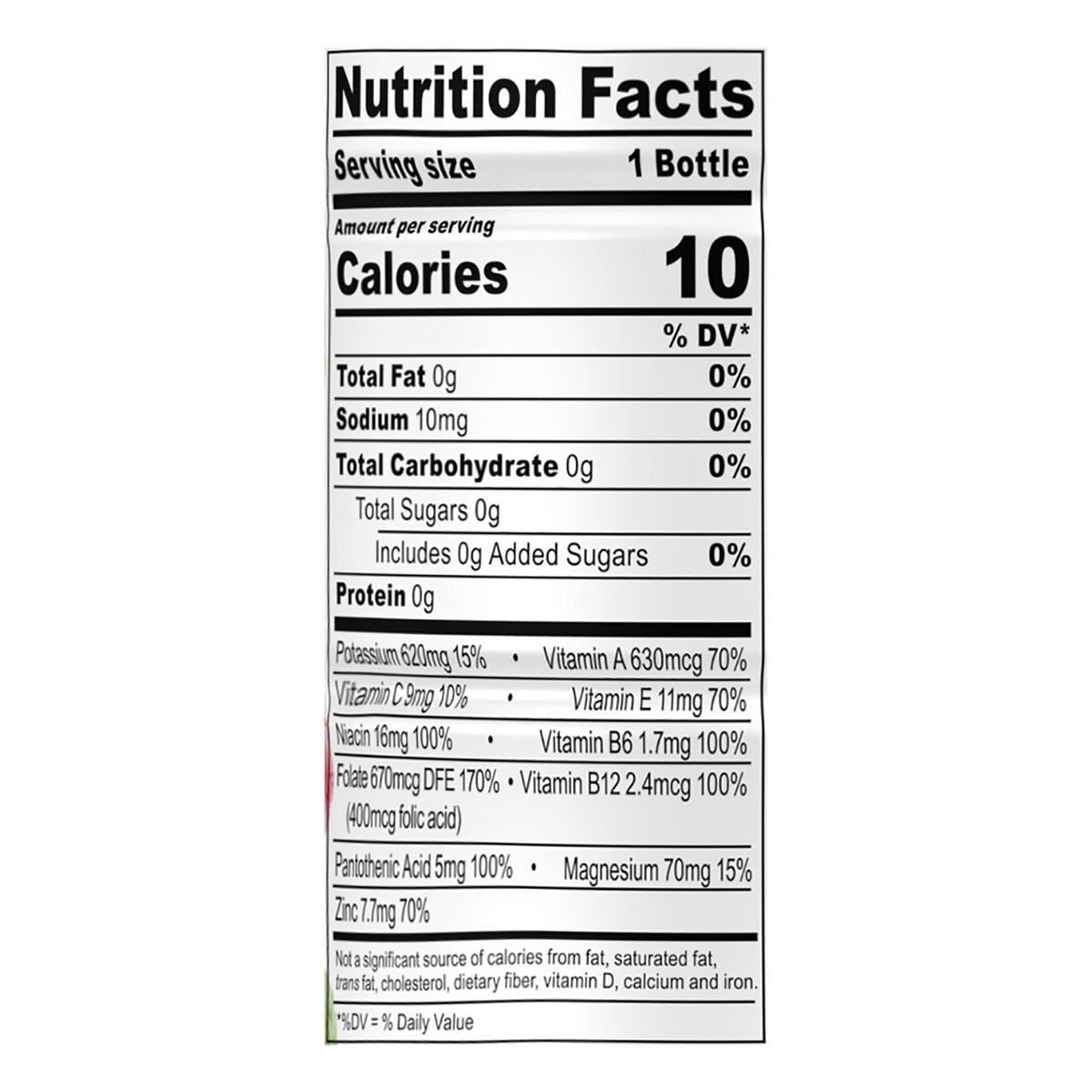 Water, Citric Acid, Dipotassium Phosphate, Vegetable Juice (Color), Steviol Glycosides (>95%), Magnesium Oxide, Natural Flavor, Ascorbic Acid, D-Calcium Pantothenate, Niacinamide, Gum Arabic, Alpha…