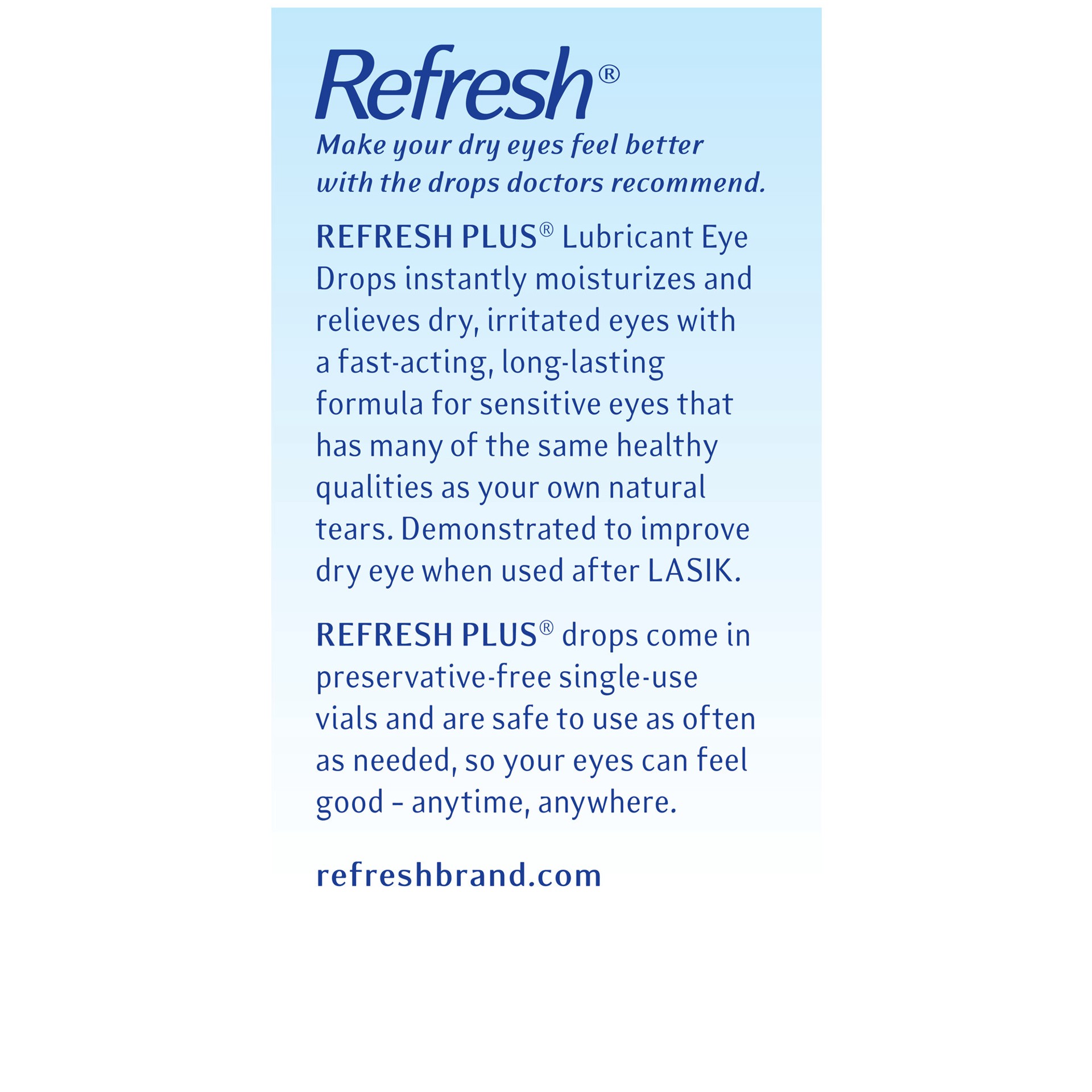 REFRESH PLUS Lubricant Eye Drops instantly moisturize and relieve mild symptoms of eye dryness, including burning, irritation, and discomfort. Original strength formula is designed to act like your ow…