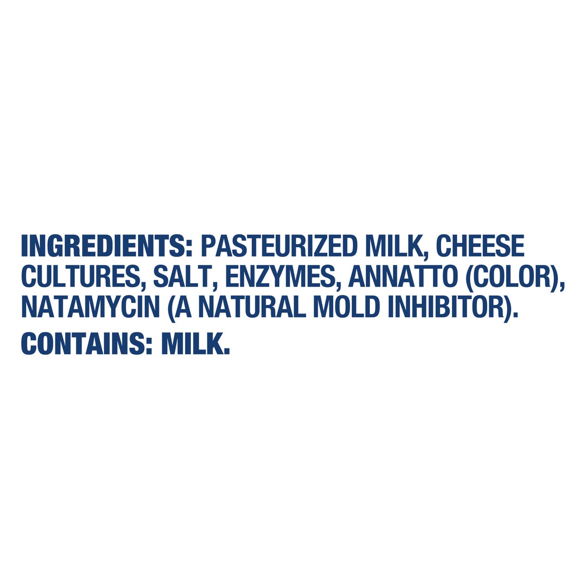 Pasteurized Milk, Cheese Cultures, Salt, Enzymes, Annatto (Color), Natamycin (a Natural Mold Inhibitor).