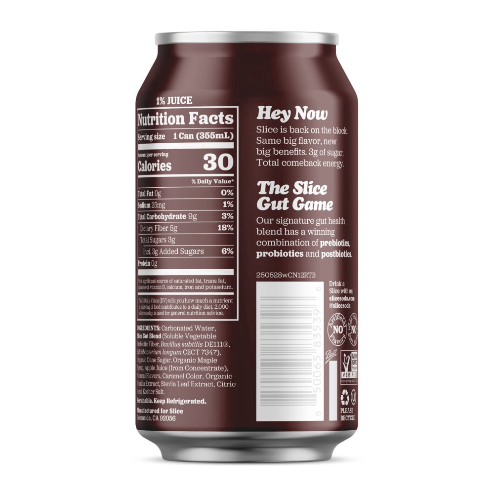 Carbonated Water, Slice Gut Blend (Soluble Vegetable Prebiotic Fiber, Bacillus subtilis DE111, Bifidobacterium longum CECT 7347), Organic Cane Sugar, Organic Maple Syrup, Apple Juice (from Concentrate…