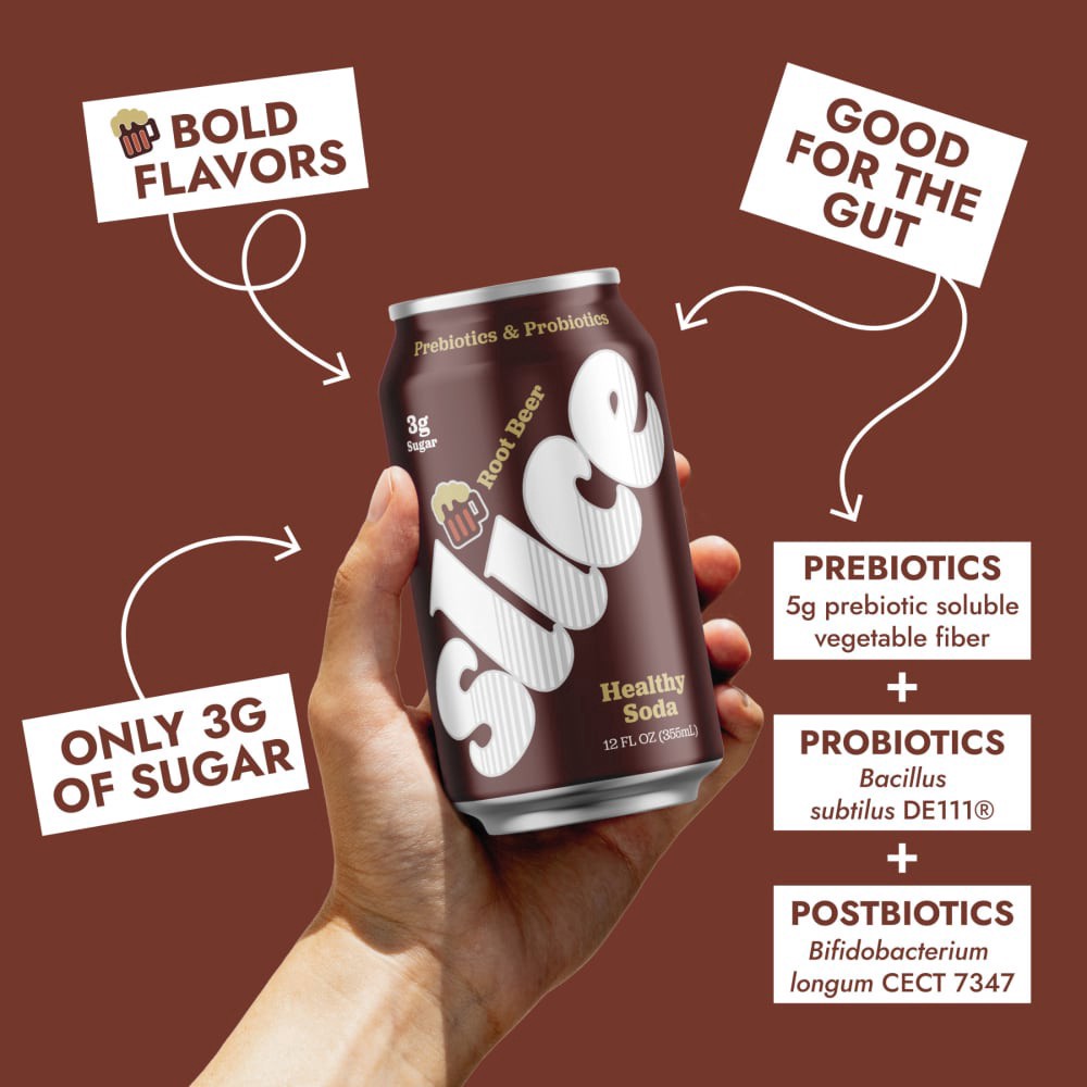 Slice is the full-flavored root beer soda you loved as a kid, now with grown-up benefits. This healthy soda contains probiotics, postbiotics, and 5 grams of prebiotic fiber to support your digestive h…