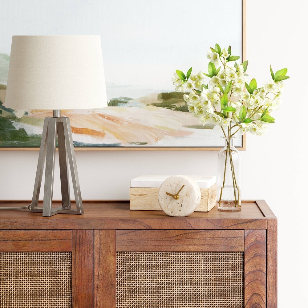 Create a whole new environment with this Linear Small Lamp Base Silver from Threshold. This lamp base has a slight pyramid shape for style, and the open design creates a casual atmosphere that's warm …