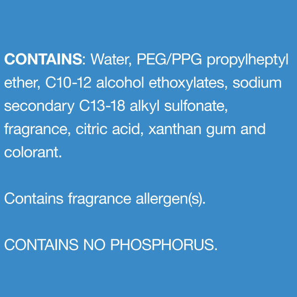 Contains: Water, PEG/PPG Propylheptyl Ether, C10-12 Alcohol Ethoxylates, Sodium Secondary C13-18 Alkyl Sulfonate, Fragrance, Citric Acid, Xanthan Gum and Colorant.