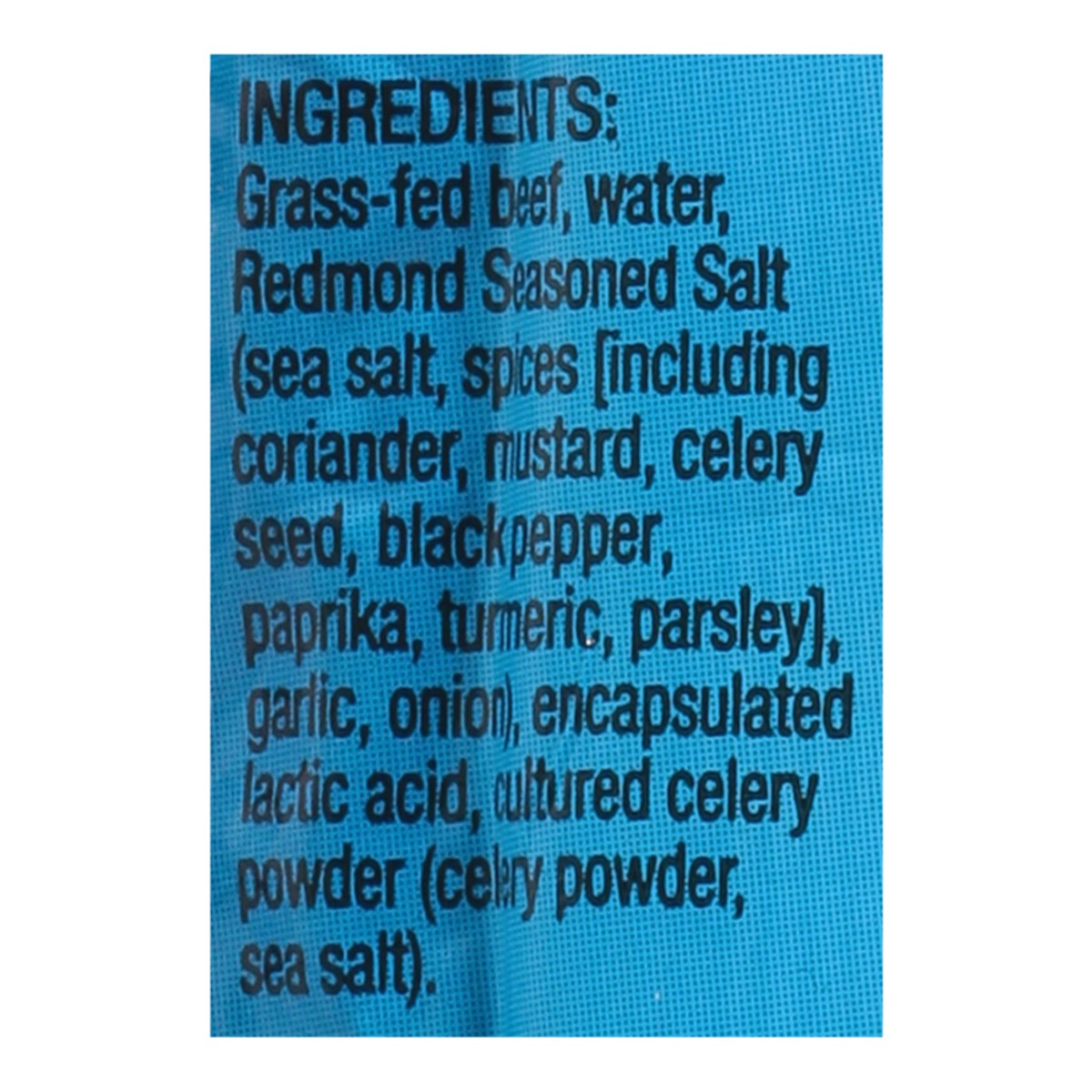 Grass-Fed Beef, Water, Redmond Seasoned Salt (Sea Salt, Spices [Including Coriander, Mustard, Celery Seed, Black Pepper, Paprika, Turmeric, Parsley], Garlic, Onion), Encapsulated Lactic Acid, Cultured…