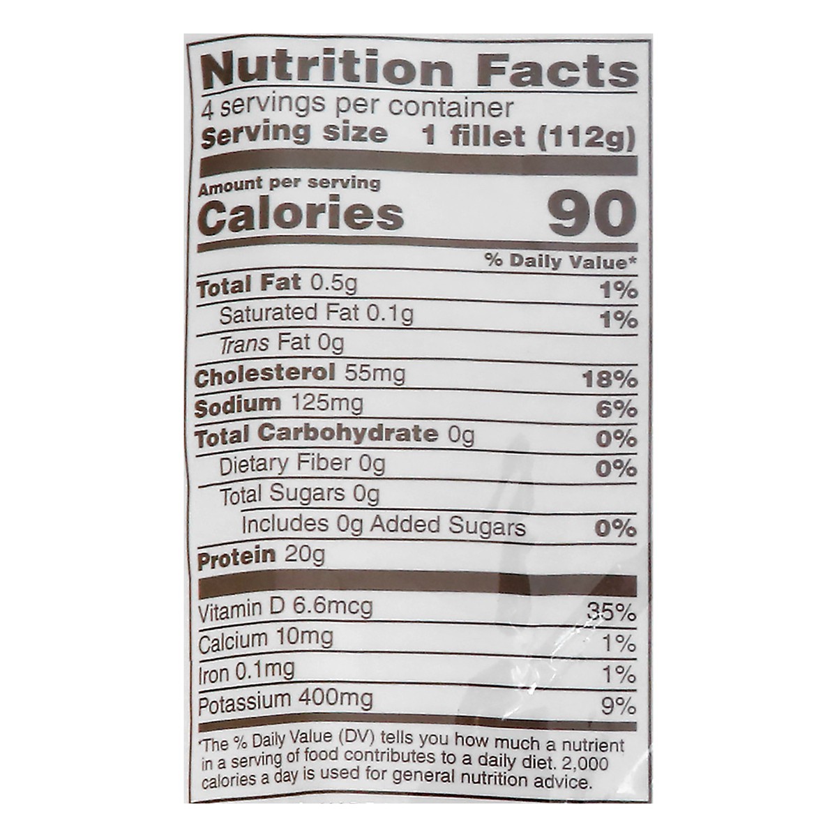 Per 1 Fillet Serving: 90 calories; 0.1 g sat fat (1% DV); 125 mg sodium (6% DV); 0 g total sugars. Ready to cook. Boneless & skin-on. Individually quick frozen and vacuum packed. Quality & satisfactio…