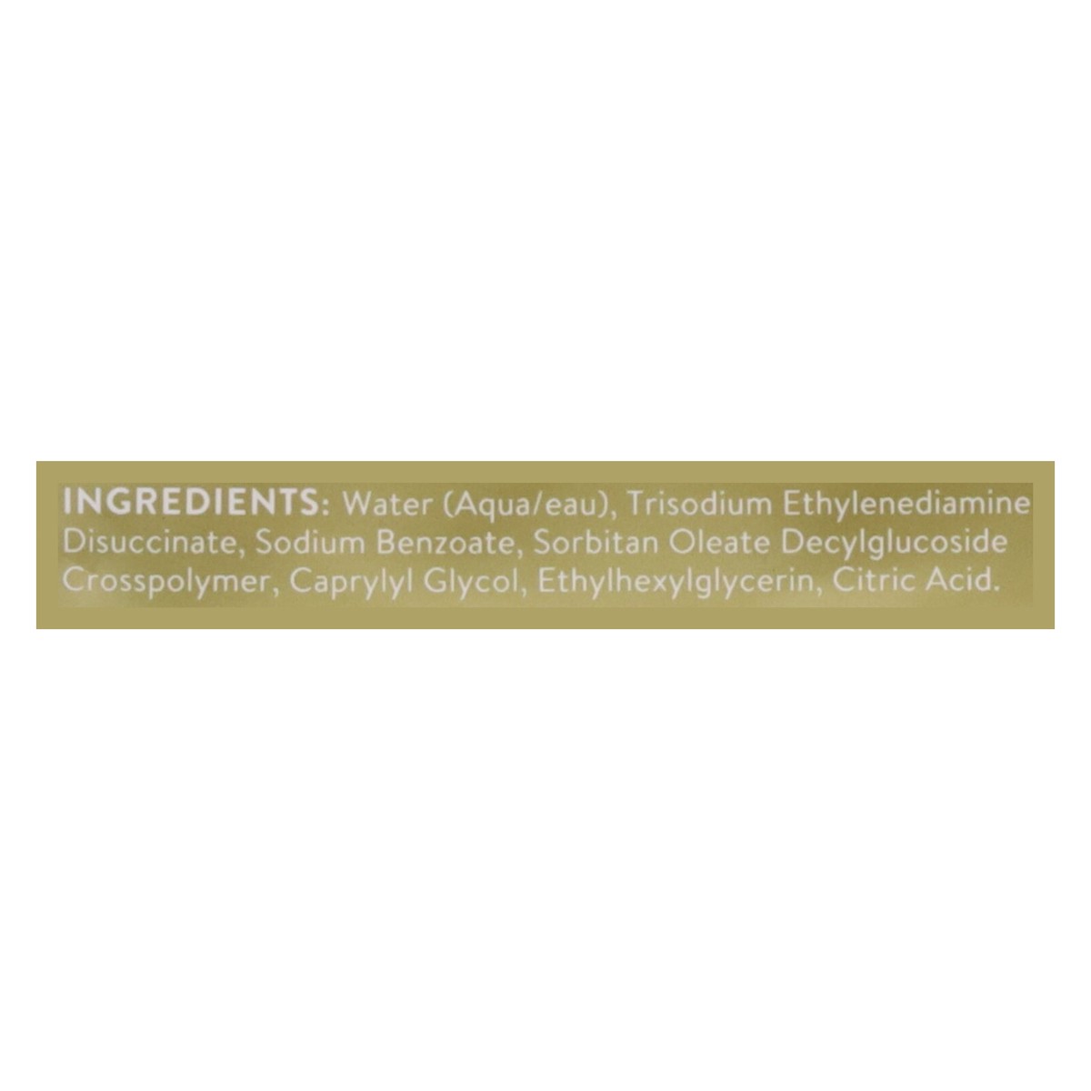 Water (Aqua/Eau), Trisodium Ethylenediamine Disuccinate, Sodium Benzoate, Sorbitan Oleate Decylglucoside Crosspolymer, Caprylyl Glycol, Ethylhexylglycerin, Citric Acid.
