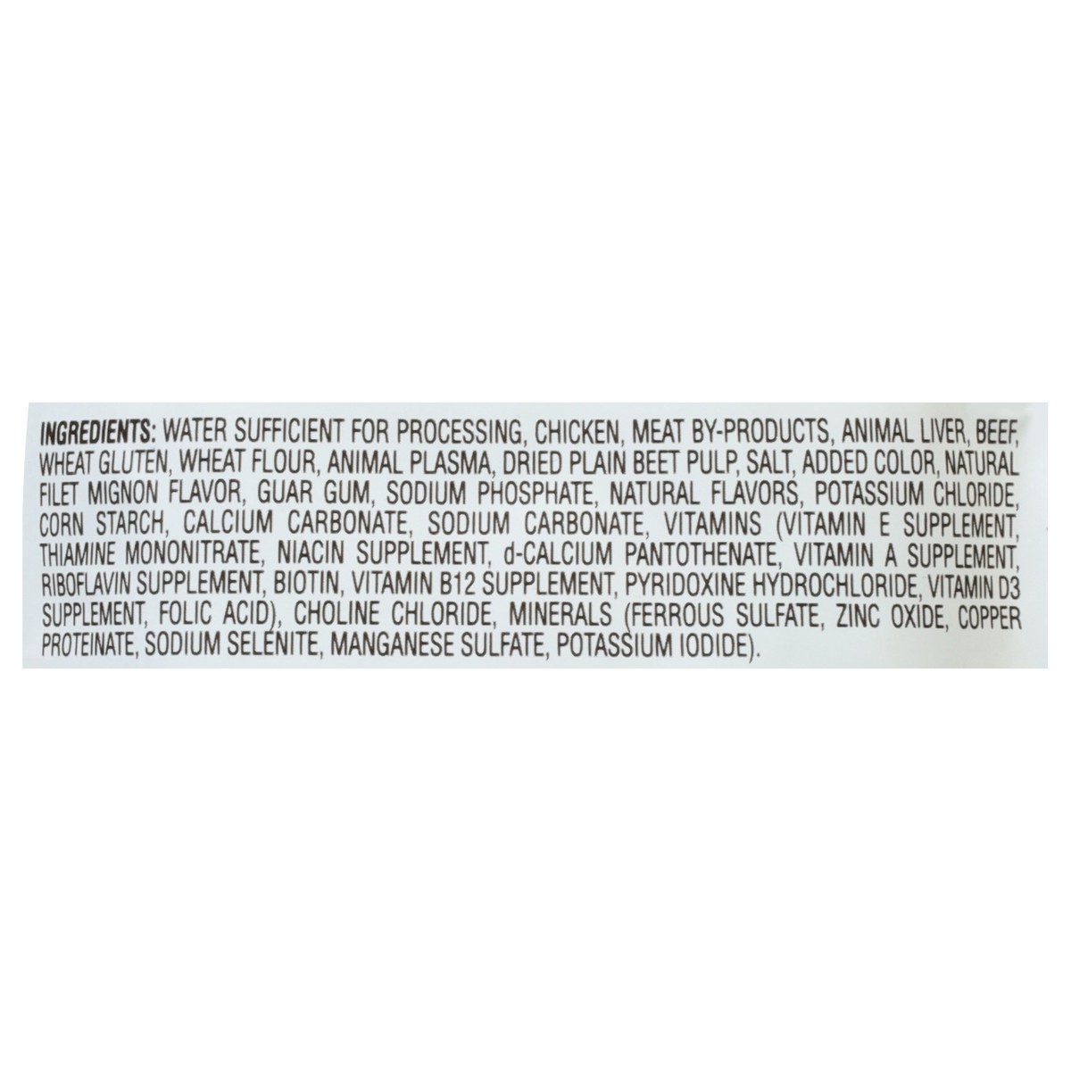 Water Sufficient for Processing, Chicken, Meat By-Products, Animal Liver, Beef, Wheat Gluten, Wheat Flour, Animal Plasma, Dried Plain Beet Pulp, Salt, Added Color, Natural Filet Mignon Flavor, Guar Gu…