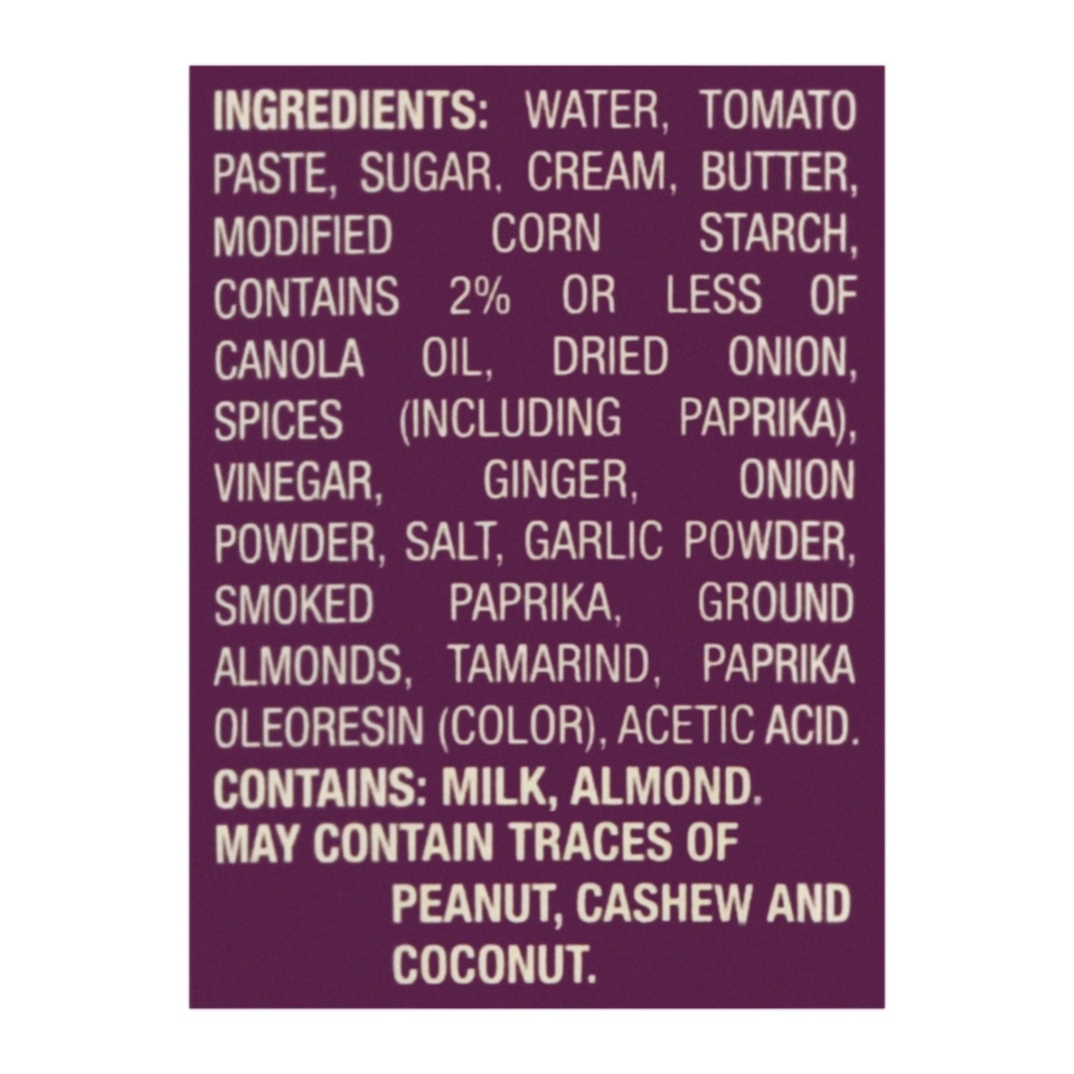 Water, Tomato Paste, Sugar, Food Starch-Modified, Contains 2% or Less of Butter, Cream, Dried Onion, Spices (Including Smoked Paprika and Paprika), Ginger, Canola Oil, Onion Powder, Salt, Whey Protein…