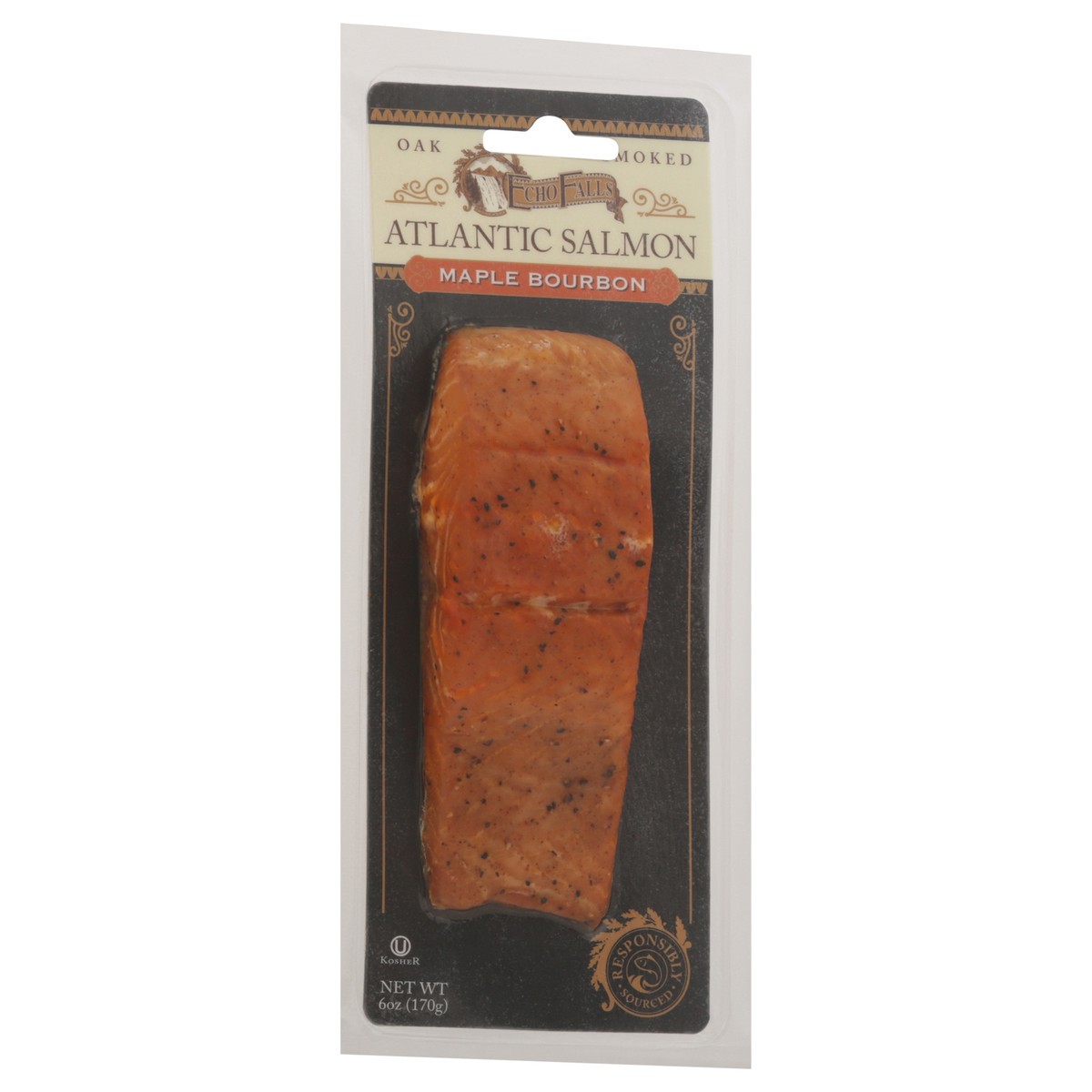 Smoked Atlantic Salmon (Color Added), Brown Sugar, Salt, Maple Bourbon Seasoning [Brown Sugar, Sugar, Salt, Paprika, Natural Bourbon Whiskey Flavor, (Dextrose, Natural Flavor, Water, Ethyl Alcohol), N…