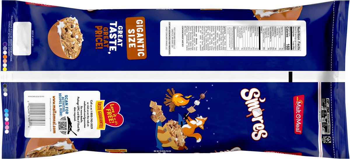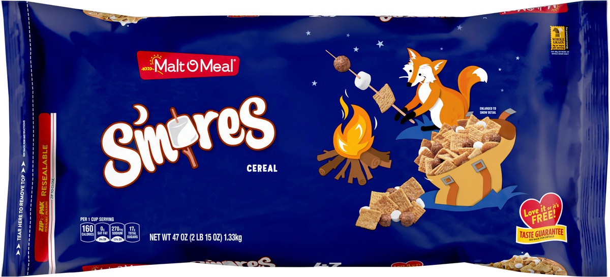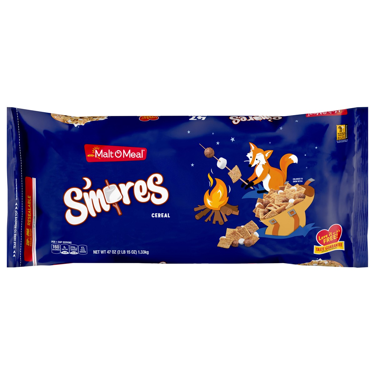 - The family size cereal bag saves you trips to the grocery store and ensures the whole family can enjoy a tasty bowl of Malt O Meal S'mores Cereal