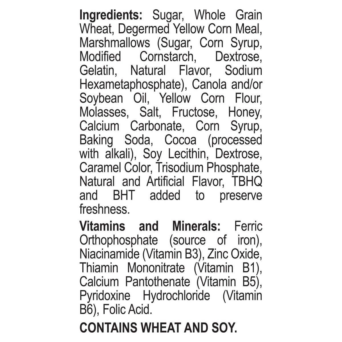 Sugar, Corn Meal, Whole Grain Wheat, Marshmallows (Sugar, Modified Cornstarch, Corn Syrup, Dextrose, Gelatin, Sodium, Hexametaphosphate, Natural and Artificial Flavor), Canola and/or Soybean Oil, Corn…
