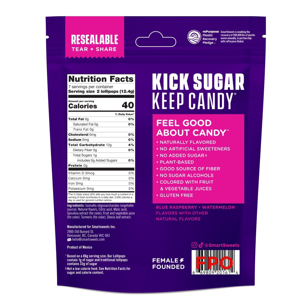 A spooky spin on a classic, Halloween Lollipops come with 12 individually wrapped lollipops and two fruity flavors per bag: Boo Raspberry and Watermelon Brew. Smartly sweetened with high quality stevi…