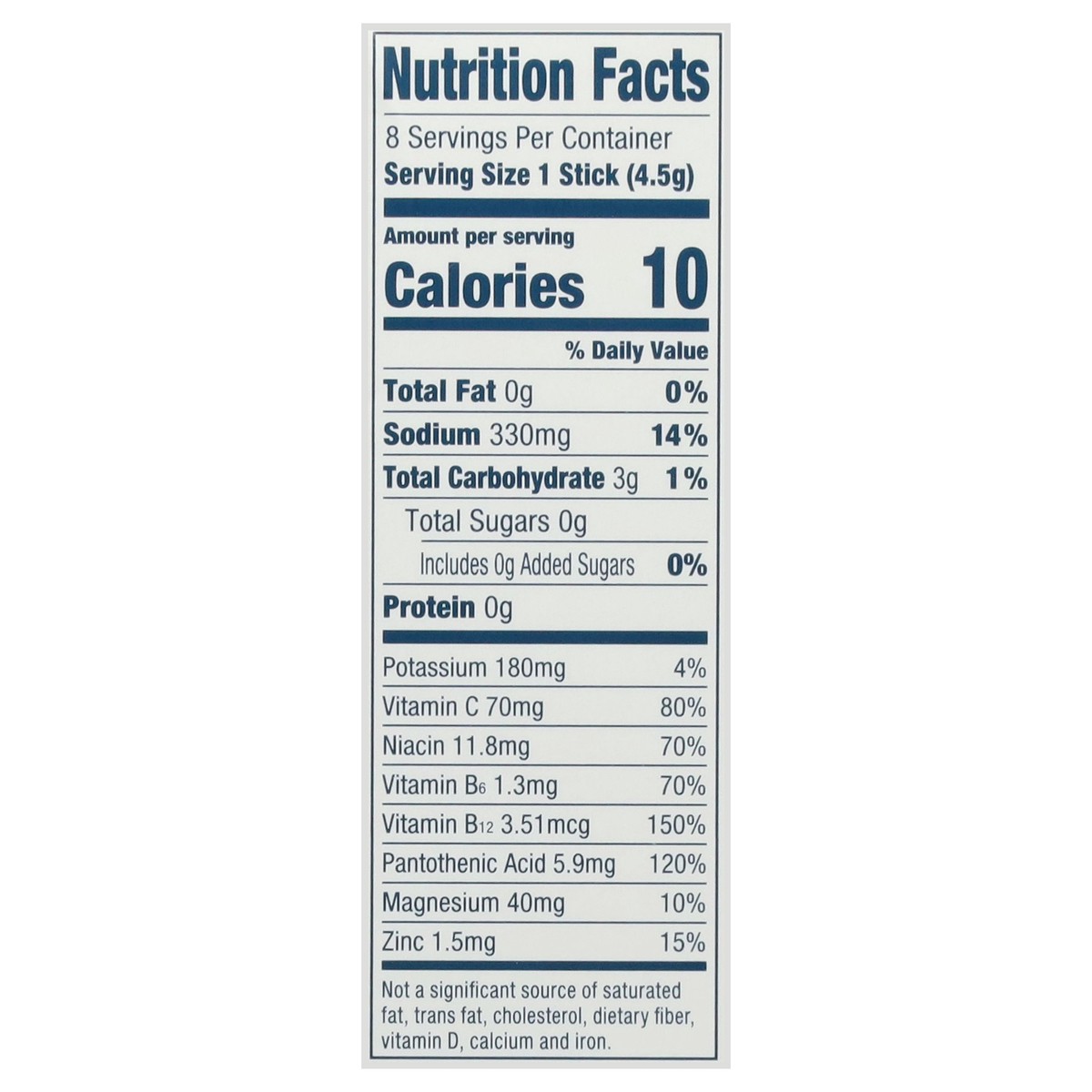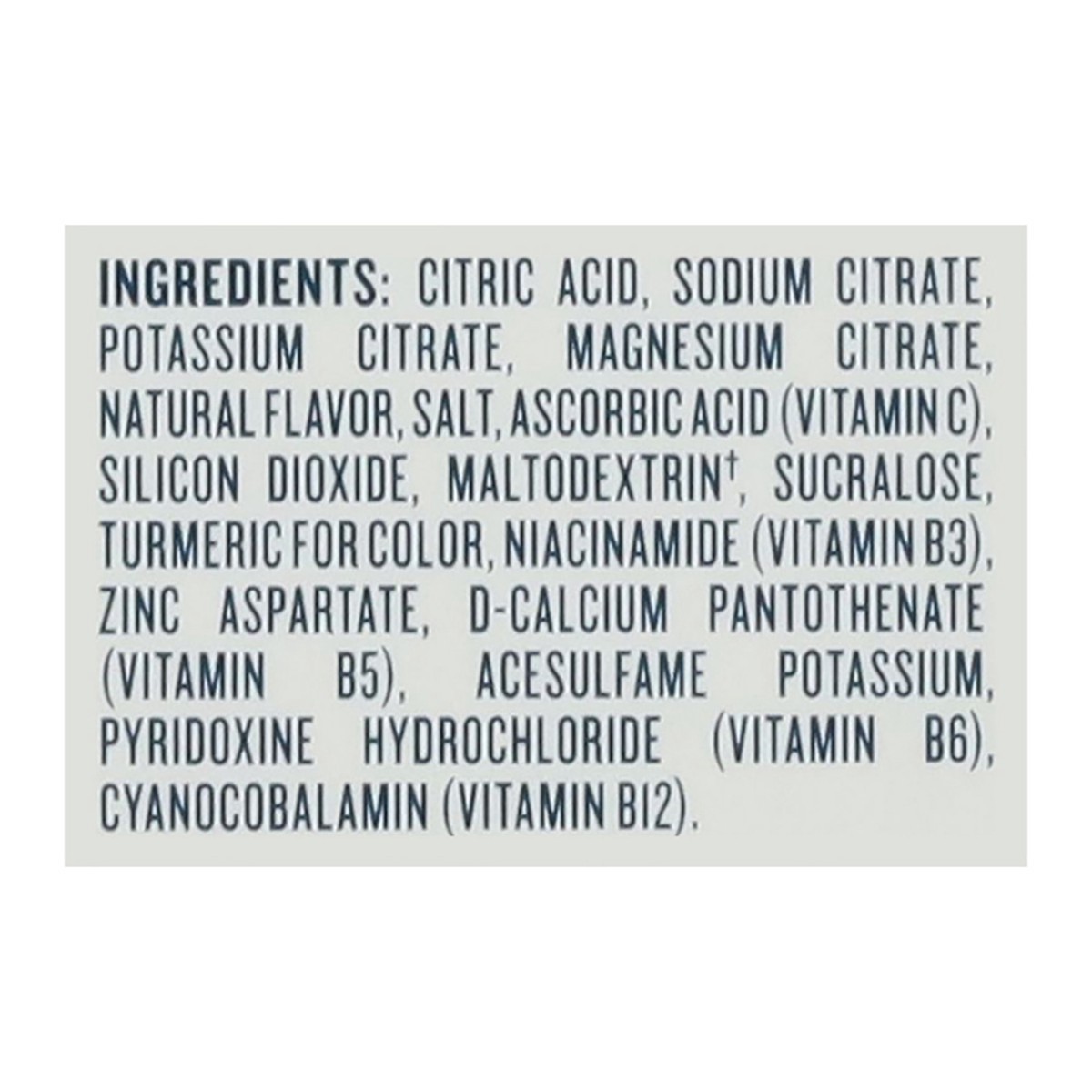 Citric Acid, Sodium Citrate, Potassium Citrate, Magnesium Citrate, Natural Flavor, Salt, Ascorbic Acid (Vitamin C), Silicon Dioxide, Maltodextrin(a), Sucralose, Turmeric for Color, Niacinamide (Vitami…