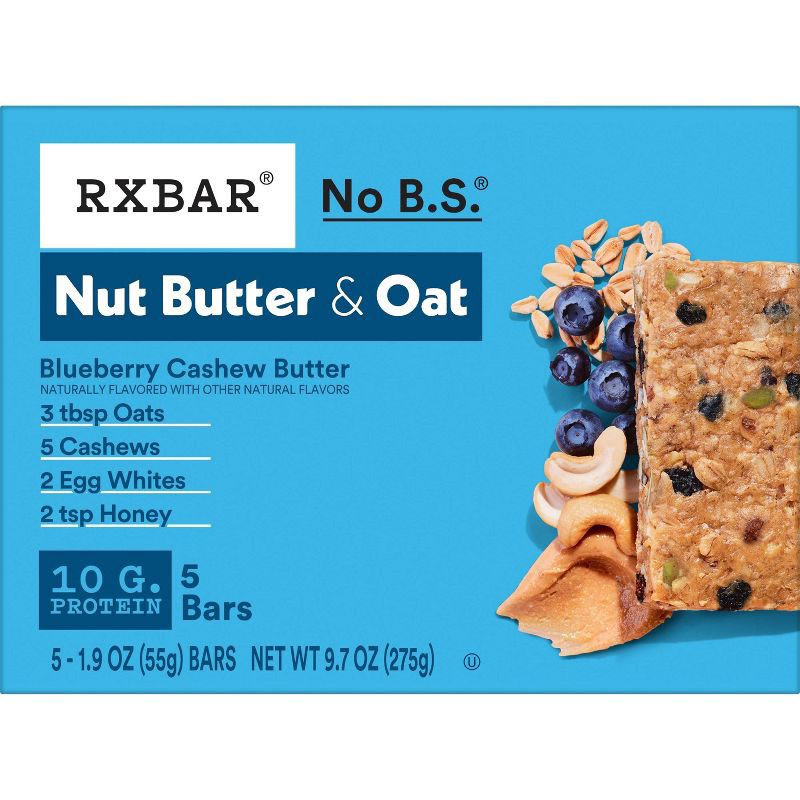 - Includes 1, 9.7oz box containing 5 RXBAR Nut Butter and Oat Blueberry Cashew Butter protein bars