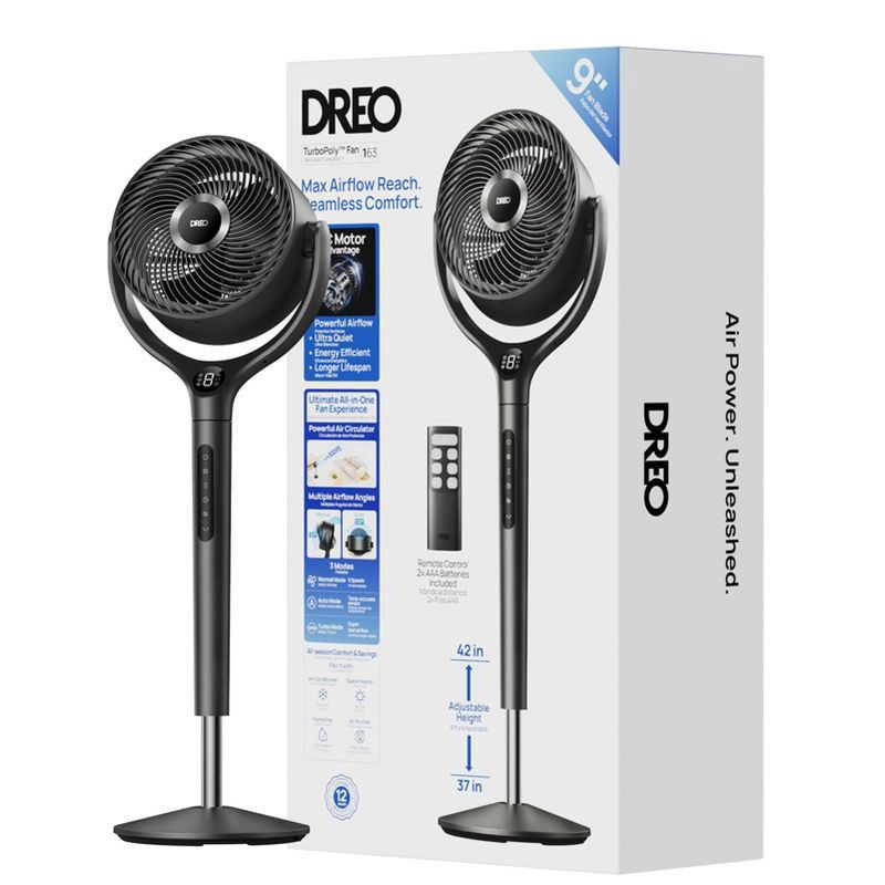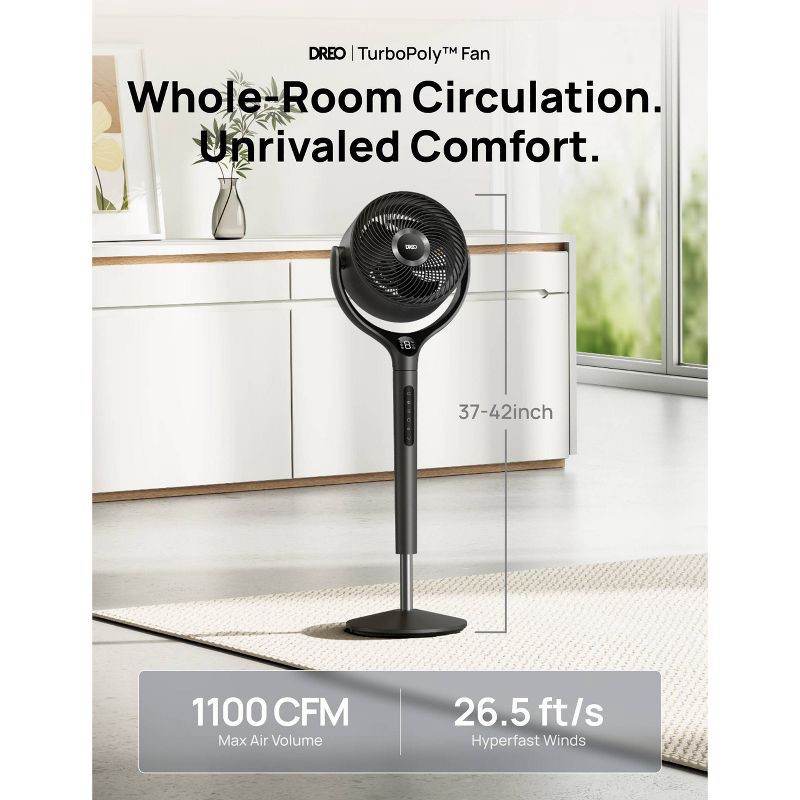 Enjoy fast, even cooling with the DREO TurboPoly™ Fan, delivering powerful airflow up to 26.57 ft/s and an extended 100 ft air reach for true whole-room circulation. Its advanced airflow design refres…