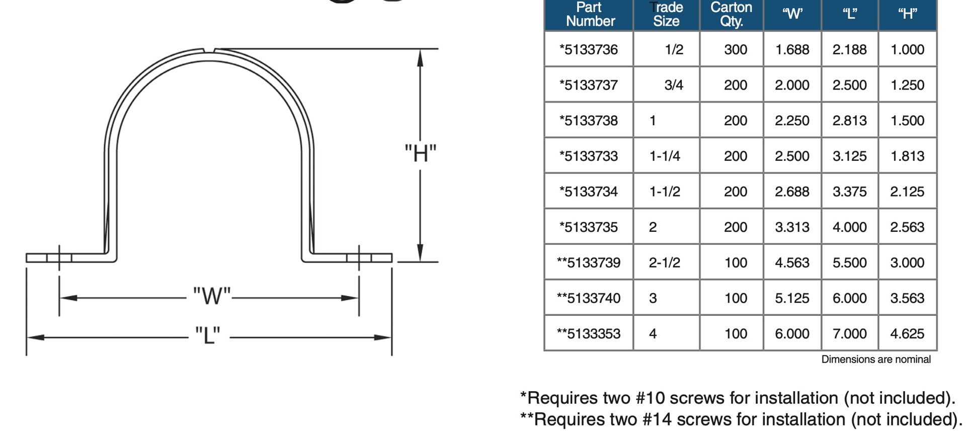 Two holes in the feet of the clamp allow mounting either screws or nails. Durable non-conductive PVC will not rust or corrode. For used with schedule 40 and 80 conduit. UL Listed. Made in USA.
