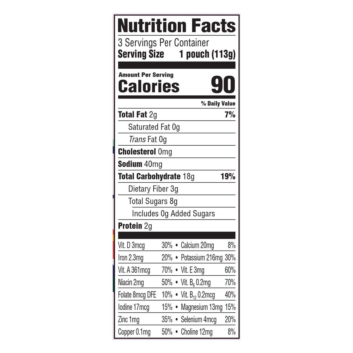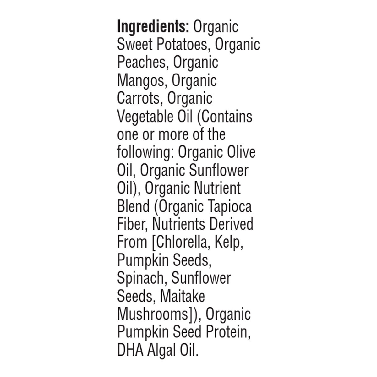 Organic Sweet Potatoes, Organic Peaches, Organic Mangos, Organic Carrots, Organic Vegetable Oil (Contains One or More of the Following: Organic Olive Oil, Organic Sunflower Oil), Organic Nutrient Blen…